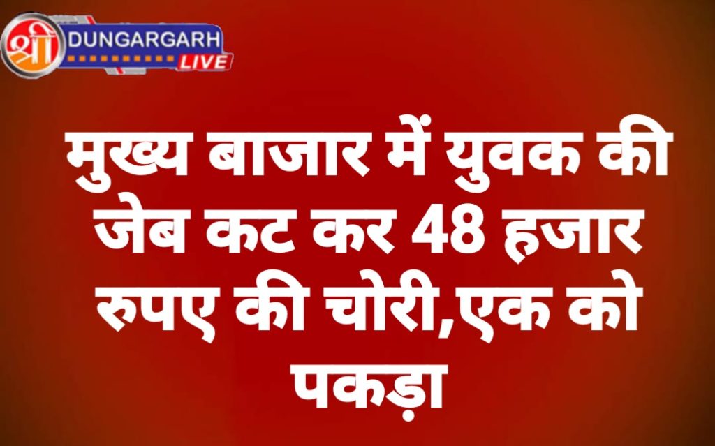 लूणकरणसर बुधवार को कस्बे के मुख्य बाजार में एक किसान की जेब से चोरों ने 48 हजार रुपए चुरा लिए। पता चलने पर ग्रामीणों ने एक चोर को मौके पर पकड़ लिया। लेकिन दो चोर चुराए रुपए लेकर भागने में सफल हो गए। हेड कांस्टेबल सुरेश सिंह मीणा ने बताया कि कांकड़वाला निवासी सेठाराम भाट बुधवार को लूणकरणसर बाजार में अपने काम आया था। इस दौरान दोपहर करीब 2 बजे तीन जने उसके पीछे हो गए। बाजार में उसकी जेब में रखे 48 हजार रुपए की राशि चुराकर फरार हो गए।