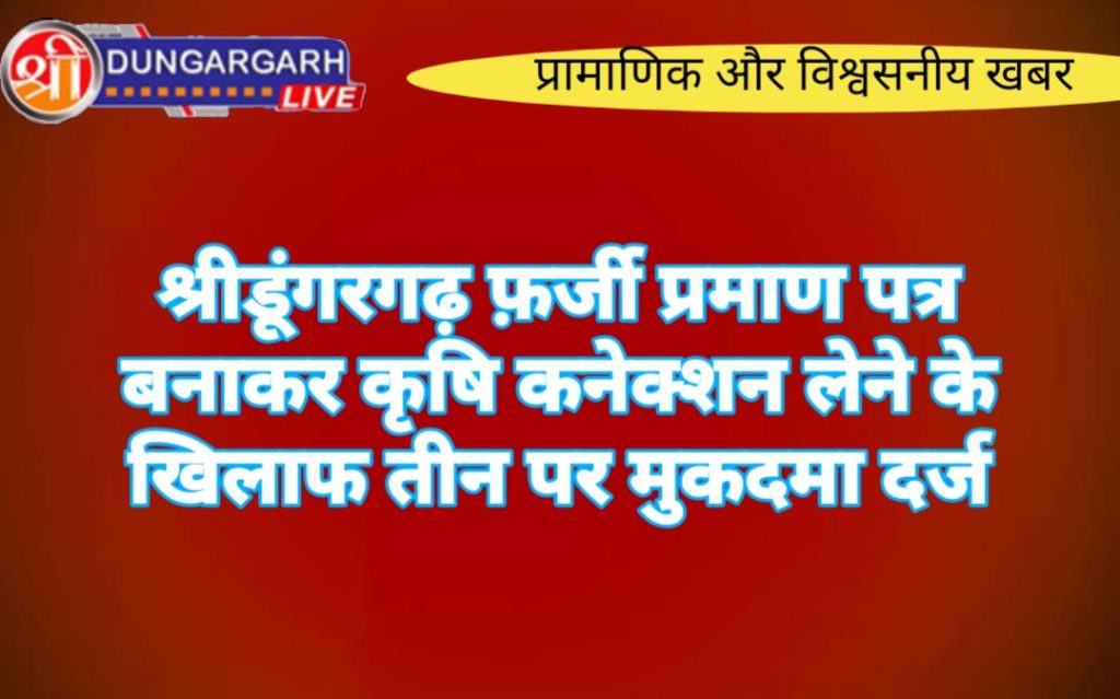 श्रीडूंगरगढ़ ग्राम लिखमादेशर मे फ़र्जी अनापत्ति प्रमाण पत्र बनाकर कृषि कनेक्शन लेने के खिलाफ तीन पर मुकदमा दर्ज किया है देवस्थान विभाग बीकानेर ने श्रीडूंगरगढ़ पुलिस थाने मे मुकदमा दर्ज करवाते हुवे कहा है कि आरोपी रामनिवास पुत्र ओंकारनाथ सिद्ध, गुमाननाथ पुत्र प्रहलाद नाथ सिद्ध, श्रीमति पार्वती देवी पत्नि जगदीश नाथ सिद्ध ने फ़र्जी अनापत्ति प्रमाण पत्र बनाकर कृषि कनेक्शन लिया जो कि ग्राम लिखनादेशर मे जसन्नाथ महाराज का मन्दिर राजकीय नहीं है और देवस्थान विभाग ने कभी इनको अनापत्ति प्रमाणपत्र जारी नहीं किया ये फ़र्जी है और इनकी जांच करके इनके विरुद्ध मुकदमा दर्ज कर कार्यवाही करे श्रीडूंगरगढ़ थाने मे इन तीनों के खिलाफ मुकदमा दर्ज कर लिया है और जांच बलबीर सिंह को सौप दी है