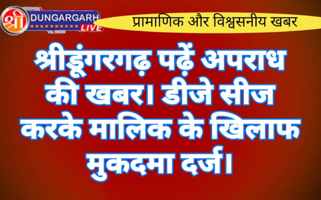 श्रीडूंगरगढ़ से परसनेऊ जा रहे पैदल यात्रियों के साथ बज रहे डीजे साउंड को पुलिस ने सीज करके डीजे मालिक के खिलाफ मुकदमा दर्ज कर लिया है आपको बता देवे की पूर्व मे डीजे पर जिला कलेक्टर और जिला पुलिस द्वारा डीजे पर प्रतिबंध लगाया हुआ है बिग्गा गांव के पास बस स्टेंड पर तेज गति से बज रहे डीजे को पुलिस ने रुकवाकर सीज कर लिया है डीजे मालिक श्रीराम पुत्र दानाराम निवासी ठूकरियासर के खिलाफ मुकदमा दर्ज कर जांच हवासिंह को सुपुर्द कर दी है