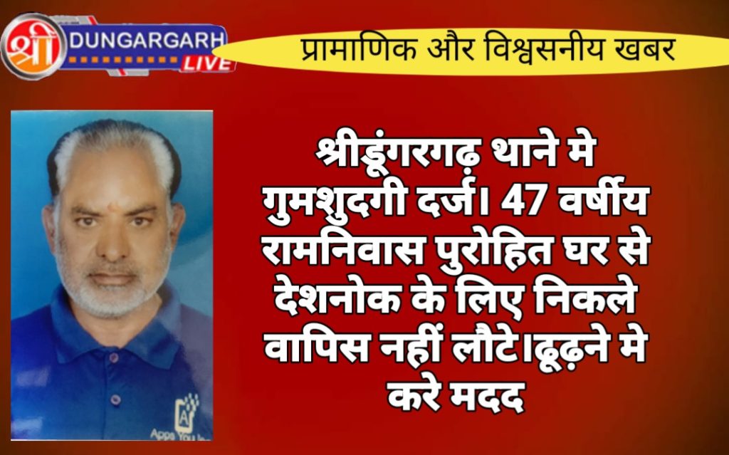 श्रीडूंगरगढ़ थाने मे गुमशुदगी दर्ज करवाते हुवे ओमप्रकाश पुरोहित पुत्र अर्जुनराम जाति पुरोहित निवासी कालू बास श्रीडूंगरगढ़ ने बताया कि मेरा छोटा भाई रामनिवास उम्र 47 वर्ष 5 सितंबर को समय सुबह 10 बजे में देशनोक के लिए रवाना हुए थे जो अब तक घर पर नहीं पहुचा हैं मैने मेरे भाई रामनिवास के मोबाईल नम्बर 9983249242 व 8875749242 पर कॉल किया तो मेरे भाई रामनिवास का मोबाईल बंद आ रहा था। बाद हमने मेरे भाई को नाते रिस्तेदारी के खूब तलाश किया वो पर भी पता नहीं चला मेरे भाई रामनिवास ने पेन्ट व टी शर्ट पहन रखी थी। श्रीडूंगरगढ़ लाइव न्युज के सभी पाठक रामनिवास उम्र 47 साल ढूढ़ने मे मदद करे संपर्क 7229880197,9983292304