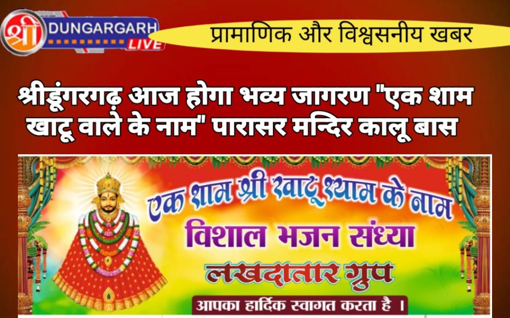श्रीडूंगरगढ़ आज होगा विशाल भव्य जागरण एक शाम खाटू वाले के नाम । कालू बास पाराशर मंदिर के पास 9 सितंबर 2023 रात्रि 8:00 बजे से और बाबा श्याम की ज्योत का दर्शन भी करने का सौभाग्य श्रीडूंगरगढ़ में होने वाला है ज्योत पर बैठने वाले मुख्य खाटू श्याम मंदिर के निज मंदिर के पुजारी होगे महाराज श्रीभूपेंद्र सिंह होगे।जागरण कलाकार बाबा बर्फानी, राज राजपुरोहित कोलकाता ,रामदेव गहलोत बीकानेर ,हनुमान कुदाल और दिलीप कुदाल श्रीडूंगरगढ़ होगे।लखदातार ग्रुप के सभी श्याम भत्तों की सेवा मे हाजिर रहेगे । प्रोग्राम का लाइव A To Z Sridungargarh yyoutube chenal पर किया जायेगा