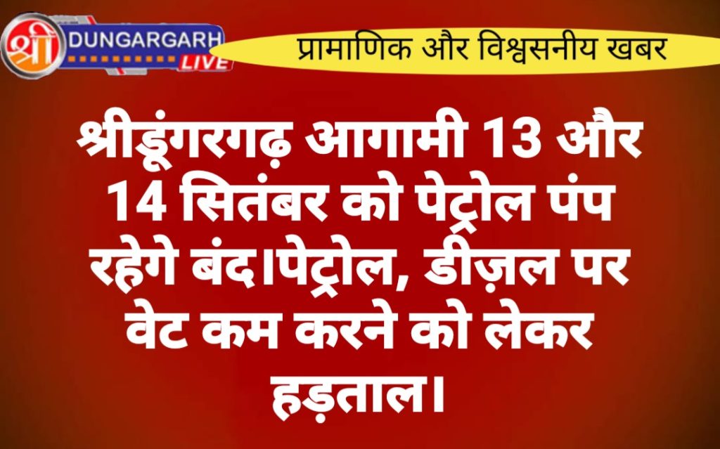 राजस्थान पेट्रोलियम डीलर्स एसोसिएशन की ओर से राजस्थान में पेट्रोल-डीजल पर वैट कम करने की मांग को लेकर दो दिन पेट्रोल पम्प बंद रहेंगे। इसके बाद भी वैट कम नहीं किया तो एसोसिएशन ने अनिश्चितकालीन हड़ताल की चेतावनी दी है।बीकानेर जिला पेट्रोलियम पदार्थ विक्रेता संघ के अध्यक्ष सुरपत सिंह ने बताया कि पड़ौसी राज्यों हरियाणा, पंजाब, देहली, गुजरात के मुकाबले राजस्थान में पेट्रोल डीजल पर वैट अधिक होने से पेट्रोल 13 रुपए व डीजल 10 रुपए महंगा है। ऐसे में राजस्थान के लोग पड़ौसी राज्यों से पेट्रोल डीजल खरीद रहे है जिससे राजस्थान के पेट्रोल पम्प संचालकों की बिक्री कम हो गई। वैट कम करने की मांग को लेकर पहले भी राज्य सरकार से कई बार आग्रह किया लेकिन सरकार ध्यान नहीं दे रही।उन्होंने बताया कि वैट कम करने की मांग को लेकर 13 व 14 सितम्बर को पेट्रोल पम्प सुबह 10 से शाम 6 बजे तक बंद रहेंगे। इसका बाद भी सरकार ने वैट कम नहीं किया तो 15 सितम्बर से राजस्थान में पेट्रोल पम्पों की अनिश्चितकालीन हड़ताल रहेगी। न ही पंप संचालक पेट्रोलियम पदार्थों की खरीद करेंगे। इमरजेंसी सेवा एंबुलेंस फायर बिग्रेड आदि वाहनों को इस हड़ताल से मुक्त रखा जाएगा