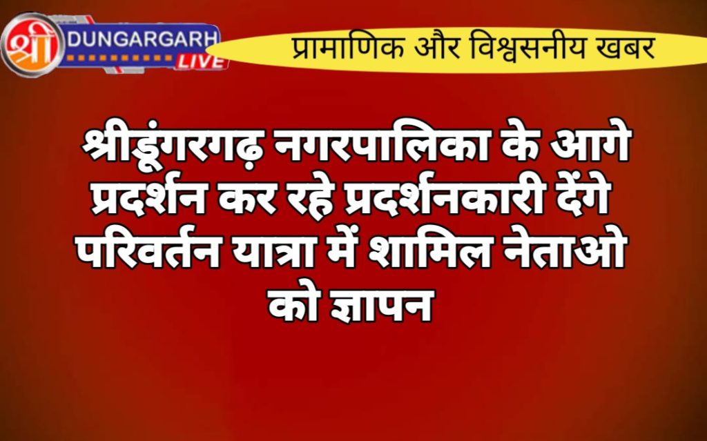 श्रीडूंगरगढ़ नगरपालिका के आगे पट्टो के लिये प्रदर्शन कर रहे प्रदर्शनकारी श्रीडूंगरगढ़ पहुंच रही भाजपा की परिवर्तन यात्रा में शामिल होकर भाजपा नेताओं को ज्ञापन देंगे। श्रीडूंगरगढ़ नगरपालिका के आगे पट्टा निर्माण के लिए रात-दिन प्रदर्शन कर प्रदर्शनकारियों ने घोषणा की है कि वे सभी भाजपा की परिवर्तन यात्रा में शामिल होंगे और भाजपा नेताओं को ज्ञापन देंगे। सभी प्रदर्शनकारी कल श्रीडूंगरगढ़ नगरपालिका के आगे महापंचायत करेंगे।