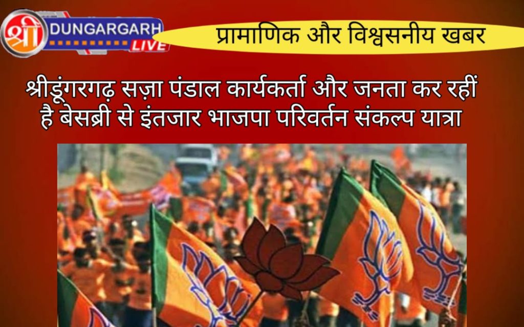 श्रीडूंगरगढ़ थोड़ा ही समय भाजपा परिवर्तन संकल्प यात्रा पहुचने वाली है पंडाल सज गया है और जनता कर रहीं है इंतजार है मंच पर लोक कलाकार द्वारा प्रस्तुतियां दी जा रहीं है जनता और कार्यकर्ताओं मे ज़बर्दस्त उत्साह दिखाई दे रहा है