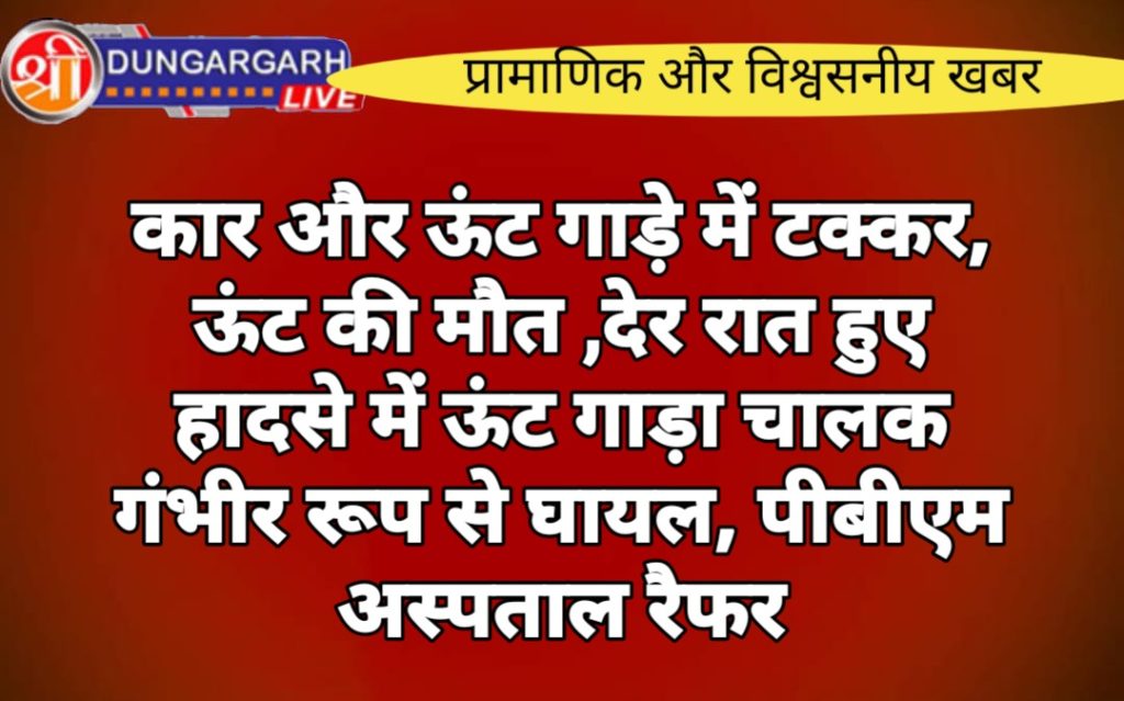 श्रीडूंगरगढ़ के पास एक सड़क हादसे में रविवार रात ऊंट की दर्दनाक मौत हो गई, जबकि ऊंट गाड़ा संचालक गंभीर रूप से घायल हो गया। जिसे बीकानेर के पीबीएम अस्पताल में रैफर किया गया है। कार में सवार युवक भी घायल हो गए।रविवार देर रात हाइवे पर चार कार सवार घायल घायल हो गए व एक ऊंट की मौत हो गई। सेरूणा के पास गाजियाबाद से बीकानेर जा रही कार ने ऊंट गाड़े को टक्कर मार दी। लकड़ी से भरा ऊंट गाड़ा बीकानेर की ओर जा रहा था। टक्कर से लकड़ियां ऊंट पर गिरी जिससे ऊंट की मौके पर ही मौत हो गयी। वहीं ऊंट गाड़ा चालक 34 वर्षीय भंवरा राम पुत्र गिरधर निवासी बांदनु घायल हो गया। उसे पहले श्रीडूंगरगढ़ के सीएचसी ले जाया गया, जहां से बीकानेर के पीबीएम अस्पताल रैफर किया गया। सेरूणा थाने के हेड कांस्टेबल मनोज कुमार ने बताया कि कार सवार 6 जनों में चार जने घायल हो गए। कार सवार गाजियाबाद निवासी इजहार, साकिर, अख्तर व मोहम्मद चांद को भी श्रीइंगरगढ़ से बीकानेर अस्पताल मे पहुचाया । श्रीडूंगरगढ़ से बीकानेर के पीबीएम अस्पताल पहुंचाया गया। देर रात नेशनल हाइवे पर रास्ता जाम हो गया। जिसे लखासर हाइवे टोल टीम ने पहुंचकर क्रेन की मदद से साफ किया इस मामले की छानबीन अब सेरुणा पुलिस कर रही