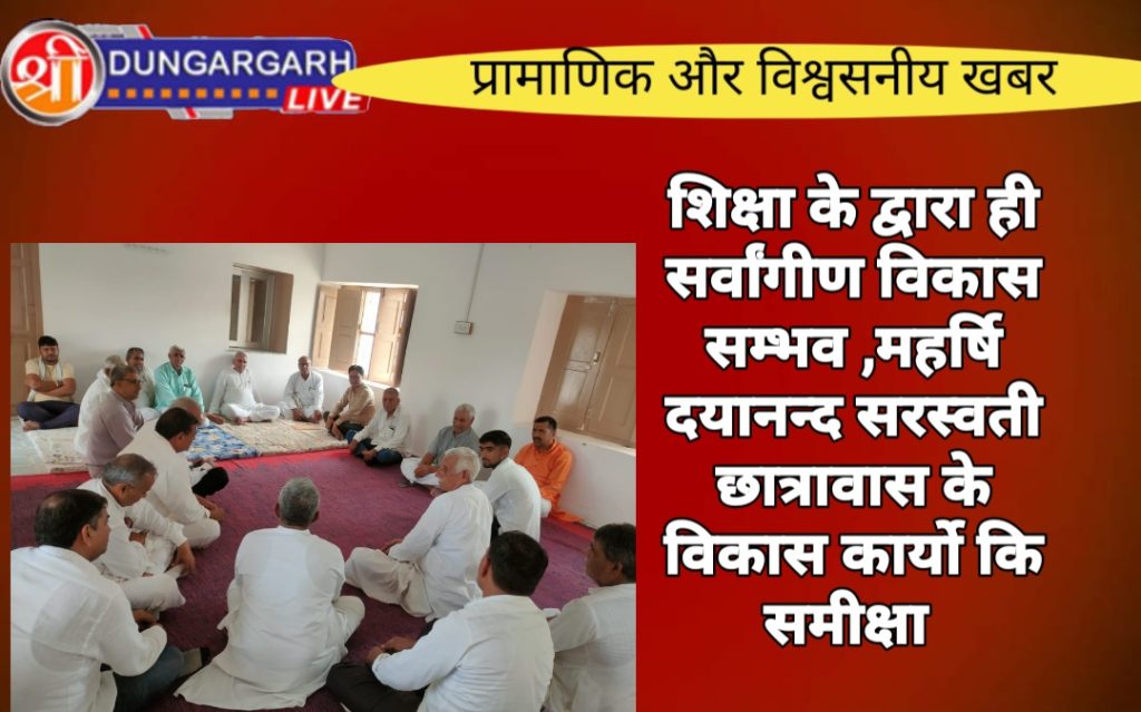 श्रीडूंगरगढ़ महर्षि दयानंद सरस्वती छात्रावास विकास समिति की बैठक श्री श्याम सुन्दर आर्य की अध्यक्षता में छात्रावास में आहूत की गई । बैठक में छात्रावास में चल रहे विकास कार्यो की समीक्षा की गई । बैठक में एडवोकेट श्यामसुन्दर आर्य ने कहा कि शिक्षा के द्वारा ही सर्वांगीण विकास सम्भव है । बालक एवं बालिकाओं को अच्छी शिक्षा हेतु समाज के प्रत्येक व्यक्ति को कदम से कदम मिलाकर साथ चलना होगा तभी त्वरित बदलाव होगा । शिक्षा में त्वरित बदलाव हेतु प्रत्येक व्यक्ति की रचनात्मक भूमिका अपेक्षित है। बैठक में सुशील सेरडिया ने आय-व्यय का ब्यौरा प्रस्तुत कर विकास कार्यो की प्रगति रिपोर्ट प्रस्तुत की । बैठक में क्रय पूर्व प्रधान दानाराम भाम्भू, विक्रय सहकारी समिति के अध्यक्ष तुलछीराम गोदारा, मोडाराम तरड़, पूर्व सरपंच लक्ष्मणराम खिलेरी, तोलाराम जाखड़, कोडाराम भादू, चान्दराम चाहर,ओमप्रकाश भादू, रामचंद्र गिला, धर्मपाल बांगड़वा, गणेश पोटलिया, किशनलाल हुड्डा, रेखाराम लुखा, सहीराम सायच, हनुमान महिया, भंवरलाल जाखड़, श्याम सारण सहित अनेक गणमान्यजन उपस्थित रहे । छात्रावास अधीक्षक श्रवण कुमार भामू ने सभी का आभार प्रकट किया ।