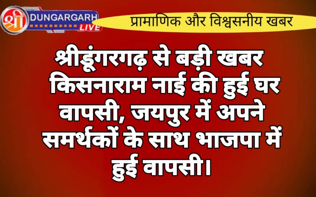 श्रीडूंगरगढ़ क्षेत्र ही नहीं बीकानेर के दिग्गज नेता पूर्व विधायक किसनाराम नाई की आज भारतीय जनता पार्टी में घर वापसी हो गई। आज सुबह पूर्व विधायक किसनाराम नाई अपने समर्थकों के साथ भाजपा प्रदेश कार्यालय पहुंचे और भाजपा के प्रदेशाध्यक्ष सीपी जोशी, अरुणसिंह के समक्ष घर वापसी की। पूर्व विधायक किसनाराम नाई के साथ पूर्व कांग्रेसी नेता और श्रीडूंगरगढ़ के निर्दलीय पार्षद सोहनलाल ओझा, मोमासर सरपंच जुगराज संचेती भी भाजपा में शामिल हुए। पूर्व विधायक के साथ नितिन नाई, डॉ दिलीपसिंह राजपुरोहित, किशनसिंह जी, रूपसिंह सिद्ध, पूरण स्वामी, मनोज दर्जी, कन्हैयालाल स्वामी, शिव मोट, सीताराम सुनार, तुलसीराम मोट सहित भाजपा के अनेक कार्यकर्ता उपस्थित रहे