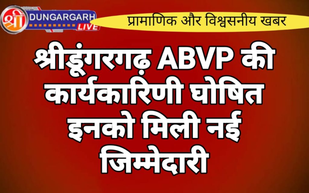 आज अखिल भारतीय विद्यार्थी परिषद श्री डूंगरगढ़ की कार्यकारिणी की घोषणा की गई नगर मंत्री योगेश पारीक ने बताया कि आज जिला प्रमुख अशोक राठौड़ एवं जिला संयोजन मनोज बिश्नोई का प्रवास रहा एवं करणी मंदिर मोमासर बास मे बेठक रखी गयी जिला संयोजक मनोज बिश्नोई ने कार्यकर्ताओं को नए सदस्य जोड़ने एव छात्रहितो के लिए आवाज उठाने की बात कही अशोक राठौड़ ने कार्यकर्ताओं से देशहित एव छात्रहित लिए काम करने की बात कही आगामी दिनों में संगठन को मजबूत करने की बात करें मंच पर नगर अध्यक्ष गोपाल कायल साथ रहे इस दोरान नगर इकाई की घोषणा की गयी जिसमे नगर मंत्री के रूप मे नवरतन सिंह बिका को नई जिम्मेदारी दी नगर सहमंत्री शुलकरल, अजय सेन ,विष्णु नाई को दी गई SFD प्रमुख श्रीभगवान पारीक SFB सह प्रमुख महेन्द्र मेघवाल ,बंशी नाई को सोशल मिडिया समोजक हरि मेघवाल को कार्यलय प्रमुख मनीष गिरी कला मंच संयोजक – आनंद जोशी, सह संयोजन हरि मेघवाल खेल संयोजन संदीप सिंह खेल सह संयोजन सुरेश मेघवाल, SFD संयोजन कुलदीप सुथार, कार्यकारिणी सदस्य हंसराज राणा, लक्ष्मण,रणजीत बावरी ,भरत संदीप सिंह आदि