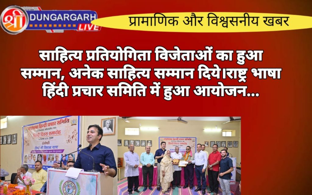 श्रीडूंगरगढ़ यहां संस्कृति भवन में गुरुवार को हिन्दी दिवस के अवसर पर साहित्य क्षेत्र में हुई प्रतियोगिता के प्रतिभागियों का सम्मान किया गया। इसमें भीष्मदेव राजपुरोहित स्मृति अखिल भारतीय राजस्थानी लघुकथा प्रतियोगिता के लिए प्रथम स्थान पर रही जयपुर की प्रेम, द्वितीय स्थान पर बीकानेर के सुनील गज्जाणी, तृतीय स्थान पर बेंगलुरु के माणक तुलसीराम गौड़ को नकद राशि व सम्मान पत्र देकर सम्मानित किया गया।