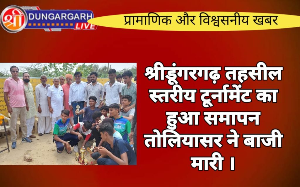 श्रीडूंगरगढ़ 67 वीं तहसील स्तरीय क्रिकेट प्रतियोगिता श्रीडूंगरगढ़ का समापन हुआ ।समापन में मुख्य अतिथि पूर्व जिलाध्यक्ष भाजपा ताराचंद सारस्वत व तोलियासर सरपंच प्रतिनिधि गिरधारी सिंह राजपुरोहित रहे।इस कार्यक्रम में हेमनाथ जाखड़, मुखदास स्वामी,ईसर राम, गोविन्द राम भगवान सिंह तंवर उपस्थित रहे।संयोजक सरस्वती उ मा विद्यालय के प्रधानाचार्य सुरेन्द्र चूरा ने बताया प्रतियोगिता का फाइनल मैच में रा उ मा वि तोलियासर ने पहले बल्लेबाजी करते हुए रा उ मा वि श्री डूंगरगढ़ को 105 रन का लक्ष्य दिया जो बनाने में असफल रही और तोलियासर टीम फाइनल विजेता रही ।