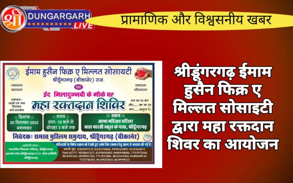 श्रीडूंगरगढ़ ईमाम हुसैन फिक्र ए मिल्लत सोसाइटी द्वारा ईद मिलादुन्नबी के मौके पर महा रक्त दान शिविर का आयोजन किया गया है तारीख 26 सितंबर-2023 मंगलवार सुबह 10 बजे से शाम 3 बजे तक स्थान जामा मस्जिद परिसर बाल भारती निकेतन स्कूल के पास रखा गया है । सहयोगी संस्थाओं मे नागरिक विकास परिषद श्रीडूंगरगढ़ , आपनो गांव सेवा समिति श्रीडूंगरगढ़ होगे। महिलाओं के लिए अलग से रक्तदान की व्यवस्था भी की गई है तो आइये उत्साह के साथ रक्तदान कर देश एवं समाज के प्रति फर्ज निभावे मृत्यु से लड़ रहे अज्ञात रोगियों की जान बचावे । निवेदन समस्त मुस्लिम समुदाय श्रीडूंगरगढ़