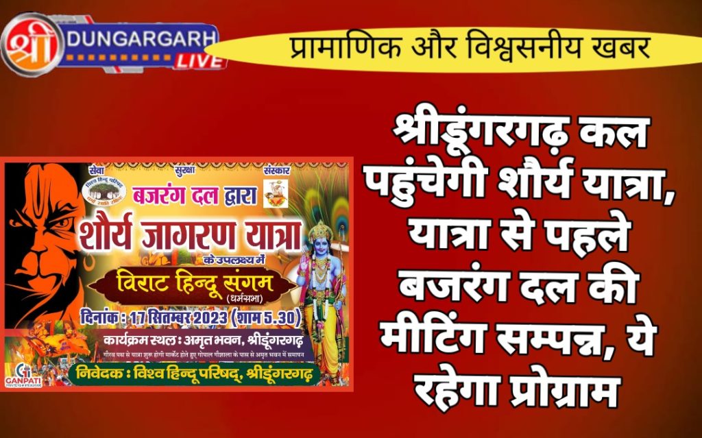 श्रीडूंगरगढ़ आज शाम 7 बजे माताजी मंदिर में बजरंग दल द्वारा मीटिंग रखी जिस में जिला सयोजक वासुदेव ने बताया कि यात्रा पूरे भारत में निकलने वाली शोर्य यात्रा है जो कल शाम 5 बजे श्रीडूंगरगढ़ पहुंचेगी वीएचपी परखंड अध्यक्ष श्याम सुन्दर जोशी ने बताया कि गोपाल गौशाला गौरव पथ से सुरु होकर अमृत भवन सभा स्थल पहुंचेगी वीएचपी मंत्री संतोष बोहरा ने बताया कि इस में श्री राम का रथ होगा वीएचपी और बजरंग दल प्रांत के सभी सदस्य मौजूद रहेंगे श्रीडूंगरगढ़ में ये वाहन यात्रा होगी ।। मिटिग में जगदीश जी स्वामी ,भवरलाल दुगड़,रणवीरसिंह खिची, ,प्रदीप जोशी ,भैराराम डूडी मौजूद रहे