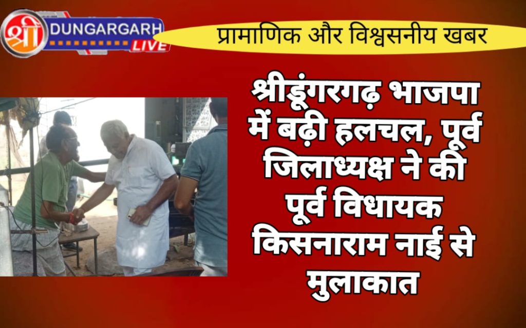 भारतीय जनता पार्टी के पूर्व जिलाध्यक्ष ताराचन्द सारस्वत ने आज पूर्व विधायक किसनाराम नाई के आवास पर जाकर औपचारिक मुलाकात की। विश्वस्त सूत्रों के अनुसार पूर्व जिलाध्यक्ष सारस्वत ने पूर्व विधायक को भाजपा कार्यालय में निमंत्रण दिया और उनके भाजपा में वापसी पर स्वागत समारोह आयोजन पर चर्चा की।