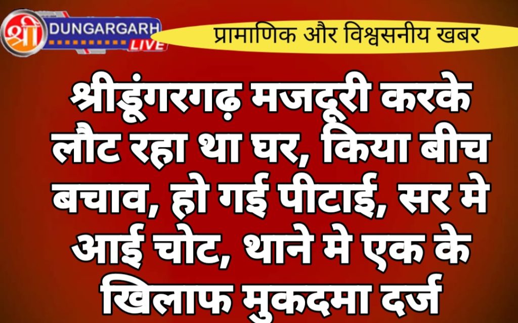 श्रीडूंगरगढ़ मजदूर मांगीलाल पुत्र जगदीश प्रजापति निवासी मोमासर बास ने बताया कि मेरे साथ मजदूर धर्मेंद्र भी मजदूरी करके लौट रहा था तभी रास्ते मे आरोपी मनीराम पुत्र गणपत राम जाट निवासी कालू बास ने धर्मेंद्र से पेसा मांगा नहीं देने पर गाली गलौज और मारपीट की जब मे मजदूर मांगीलाल ने बीच बचाव किया तो मेरे साथ भी मारपीट की ओर मेरे सर पर चोट भी आई है आरोपी ने शराब पी रखी थी। श्रीडूंगरगढ़ थाने मे आरोपी मनीराम पुत्र गणपत राम जाट के खिलाफ मुकदमा दर्ज कर जांच बलबीर सिंह को सुपुर्द कर दी है