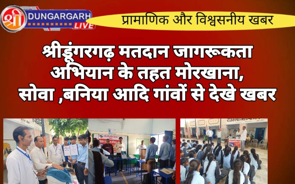 राजस्थान निर्वाचन आयोग और जिला निर्वाचन अधिकारी बीकानेर के निर्देशानुसार निर्वाचक रजिस्ट्रीकरण पदाधिकारी एवं उपखण्ड अधिकारी श्रीडूंगरगढ़ द्वारा गठित एम डी वी टीम गुरुवार को श्रीडूंगरगढ़ विधानसभा क्षेत्र में आने वाली नोखा पंचायत समिति की ग्राम पंचायतों मोरखाना ,सोवा और कुचोर के बनिया ग्राम की राउमावि बनिया, राउमावि मोरखाना, राउमावि सोवा में मतदाता जागरूकता टीम पहुँची और स्कूल स्टूडेंट्स के सम्मुख ईवीएम और वीवीपीएटी मशीनों का डेमोंस्ट्रेशन कार्यक्रम रखा गया जिसमें निर्वाचन शाखा श्रीडूंगरगढ़ से नौरत मल शर्मा एलमटी, सहीराम भामू एलमटी , किशोरी लाल मीणा आदि दक्ष प्रशिक्षकों द्वारा ईवीएम मशीन वीवीपीएटी मशीन का डेमोंस्ट्रेशन किया गया। नौरत मल शर्मा एलमटी ने बच्चों को निर्वाचन मतदान प्रक्रिया और ईवीएम से मतदान के बारे में बताया।सहीराम भामू एलमटी ने ईवीएम और वीवीपीएटी मशीनों से डेमोंस्ट्रेशन करके बच्चों को जागरूक किया।किशोरी लाल मीणा ने मतदाता शपथ दिलवाई।स्कूल विद्यार्थियों ने रुचि और उत्साह के साथ कार्यक्रम में भागीदारी निभाई। मोरखाना स्कूल में प्रिंसीपल श्री श्याम लाल छिम्पा ने निर्वाचन विभाग के आगामी नवाचारों के बारे में बताया।राउमावि सोवा में बी एल ओ उम्मेद कुमार नाई ने नए मतदाता रजिस्ट्रेशन की प्रक्रिया के बारे में जानकारी दी।