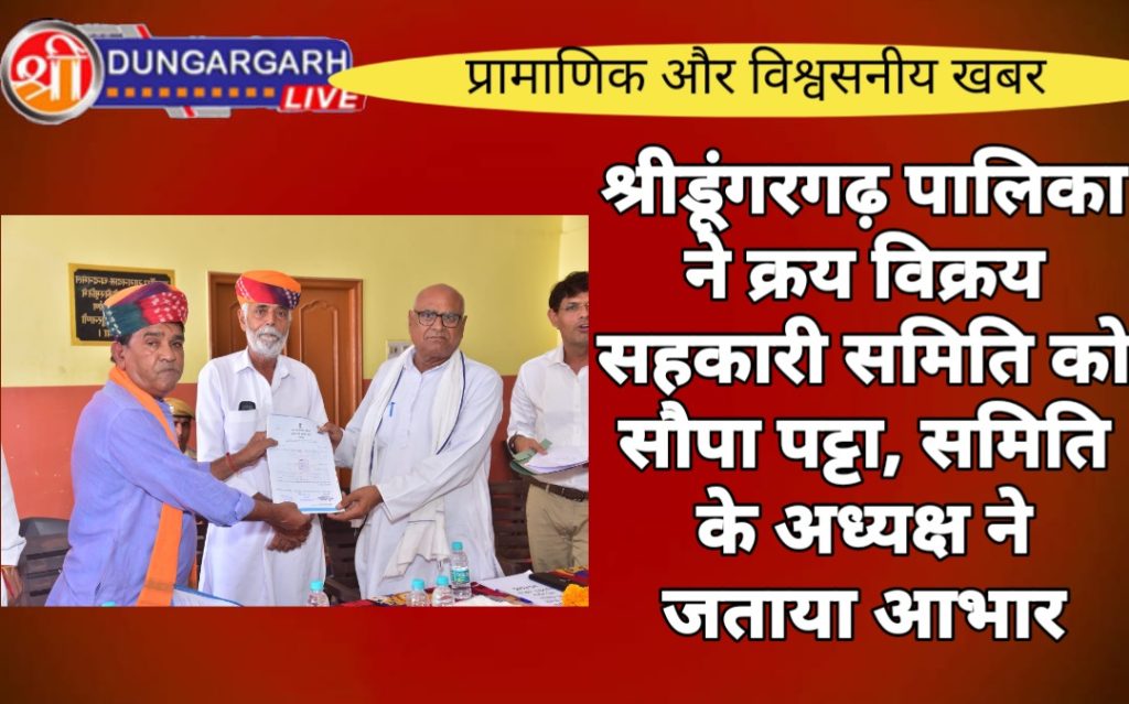 श्रीडूंगरगढ़ आज सिंधी धर्मशाला मे क्रय विक्रय सहकारी समिति की वार्षिक साधारण सभा का आयोजन किया गया। अध्यक्षता समिति के अध्यक्ष तुलछीराम गोदारा ने की। मुख्य अतिथि के रूप में विधायक गिरधारीलाल महिया व विशिष्ट अतिथि के रूप में मानमल शर्मा उपस्थित रहें। विधायक गिरधारीलाल महिया ने समिति सदस्यों को किसान हित में कार्य करने की अपील की। सभा में मुख्य व्यवस्थापक राजेश कुमार खिचड़ ने विभिन्न योजनओं की जानकारी देते हुए सभी का आभार जताया। नगरपालिका द्वारा सीओ कार्यालय श्रीडूंगरगढ़ के निकट 40×225 का पट्टा क्रय विक्रय सहकारी समिति को आवंटित किया। आज सभा में पालिकाध्यक्ष मानमल शर्मा ने पट्टा सौंपते हुए कहा कि क्षेत्र के विकास के लिए पालिका सदैव तत्पर है समिति अध्यक्ष तुलछीराम गोदारा ने शर्मा का आभार जताया।इस दौरान संचालक मंडल के मोडाराम तरड, गोपालराम भादू, मांणकचंद, मालाराम सिंवर सहित अनेक समिति सदस्य उपस्थित रहें।