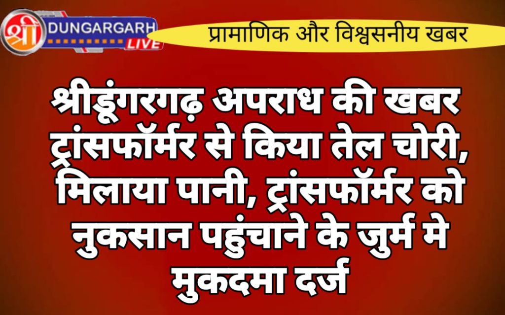 श्रीडूंगरगढ़ कनिष्ठ अभियन्ता ग्रामीण कार्यालय सहायक अभियंता जोधपुर डिस्कॉम के कर्मचारी श्रीनारायण शुक्ला पुत्र ऋषि शुक्ला ने आरोप लगाया कि सांतलेरा मे 33/11 केवी जीएसएस पर 3150 KVA ट्रांसफॉर्मर जल गया था जो कि दो दिन तक नहीं बदला गया । वहा पर ठेकेदार मौजूद था ठेकेदार खिराजराम उर्फ हरिराम पुत्र तोलाराम ने ट्रांसफॉर्मर मे से तेल चोरी कर के पानी मिला दिया और ट्रांसफॉर्मर को खुरद बुरद कर दिया जिससे विभाग को 1400 लीटर तेल 182196 रुपया का नुकसान हुआ है पुलिस मामले की जांच मे लगी है ठेकेदार खिराजराम उर्फ हरिराम पुत्र तोलाराम और ठेकाफर्म विनायक इंजीनियरिंग सीकर पर मुकदमा दर्ज कर जांच भगवाना राम को सुपुर्द कर दी है