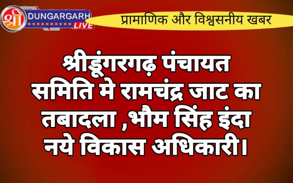 श्रीडूंगरगढ़ पंचायत समिति मे विकास अधिकारी रामचंद्र जाट का तबादला और नये विकास अधिकारी भोम सिंह इंदा होगे ।प्रदेश भर में आज फिर तबादलो का दौर चला ग्रामीण विकास व पंचायती राज विभाग के 87 अधिकारियों के स्थानांतरण किए गए है श्रीडूंगरगढ़ पंचायत समिति के विकास अधिकारी रामचंद्र जाट का तबादला कर दिया गया है और उन्हें उनके मूल विभाग शिक्षा विभाग में भेजने के निर्देश दिए गए। अब भोम सिंह इंदा श्री डूंगरगढ़ पंचायत समिति के नए विकास अधिकारी होंगे शासन सचिव घनश्याम शर्मा द्वारा आदेश जारी किए गए।