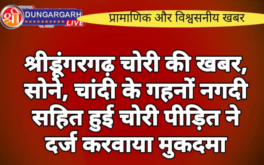 श्रीडूंगरगढ़ के गांव बिग्गा मे चोरी की खबर है भंवरलाल पुत्र अमराराम जाती जाट निवासी बिग्गा के घर हुई चोरी ,रात्री के समय चोरी हुई सुबह देखा तो घर का गेट खुला है कमरे खुले है घर मे रखे क़ीमती समान को देखा तो मिला नहीं फिर इधर उधर खोजने पर संदूक, पेटी गाय की छान मे मिली थी जिसमें समान तीन जोड़ी चांदी पाजेब, दो चांदी का कड़ा, तीन सोने के फूलरे , सोने के बालों की जोड़ी, सोने के कानो की जोड़ी सहित 12000 हजार नगदी थे चोर ने सब समान पर हाथ साफ कर दिया । पीड़ित ने अपने घर हुई चोरी की आपबीती पुलिस थाने मे आकर बताई थाने मे अज्ञात चोर के खिलाफ मुकदमा दर्ज कर जांच भगवाना राम को सुपुर्द कर दी