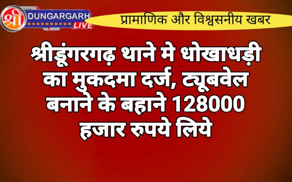 श्रीडूंगरगढ़ उपनी गांव निवासी मुखराम पुत्र प्रभुराम जाती जाट ने नोरंगराम जाट निवासी लाछड़सर पर आरोप लगाते हुवे बताया कि आरोपी ने मुझे मेरे खेत मे ट्यूबवेल बनाने के लिए मुझे कहा कि आपको ट्यूबवेल बना दूंगा अच्छा पानी आएगा अच्छी कंपनी का पाइप डालूंगा और आपके खेत मे पानी आए तो मुझे पेसा देना है पुराने ट्यूबवेल को भी और गहरा करके तैयार कर दूंगा जो हमारा सोदा 128000 हजार मे तय हुआ ।पहले दो लाख रुपये लिया फिर कुछ दिन बाद दो लाख रुपया और लिया फिर काम भी चालू कर दिया इस तरह आरोपी ने पूरे 128000 हजार रुपये ले लिया और ट्यूबवेल बनाया वो कोई काम का नहीं है उसमे मोटर भी नहीं जाता जब प्रार्थी ने ओलमा दिया तब आरोपी ने कहा कि मुझे तो आप से पेसा हड़पना था और धोका करना था आरोपी ने पीड़ित किसान को सोशल मीडिया पर बदनाम भी किया जिससे प्रार्थी को मानहानि भी हुई। पुलिस ने नौरंग राम जाट के खिलाफ मुकदमा दर्ज कर जांच एसआई रवीन्द्र सिंह कर रहे है