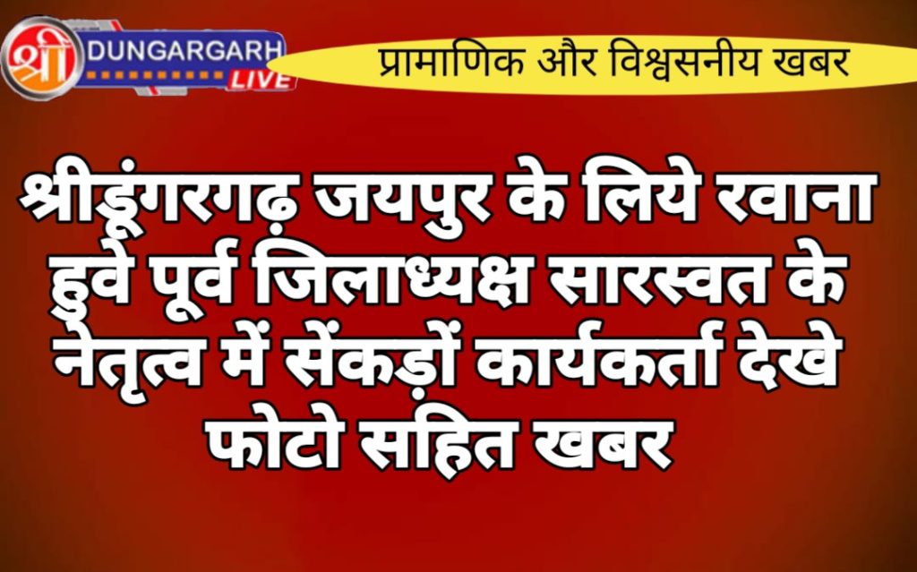 जयपुर में भारतीय जनता पार्टी की परिवर्तन संकल्प महासभा में प्रधानमंत्री श्री नरेंद्र मोदी जी के संबोधन को सुनने श्रीडूंगरगढ़ विधानसभा से सैकड़ो छोटी गाड़ियां और बस जयपुर के लिए रवाना हुई श्रीडूंगरगढ़ से पूर्व भाजपा जिलाध्यक्ष ताराचंद सारस्वत के नेतृत्व में छोटी गाड़ियां और बस में कार्यकर्ता रवाना हुए । ताराचंद सारस्वत ने पार्टी का झंडा दिखाकर गाडियां श्रीडूंगरगढ़ से रवाना की । सारस्वत ने बताया की विधानसभा क्षेत्र से सैंकड़ों गाडियां जयपुर में महासभा में शामिल होने के लिए रवाना हुई । ताराचंद सारस्वत के साथ पूर्व जिला परिषद सदस्य हेमनाथ जाखड़,महामंत्री महेश राजोतिया,प्रवासी जिला संयोजक ब्रजलाल तावनियां, बिग्गा सरपंच जसवीर सारण, सरपंच हंसराज मेघवाल,पूर्व जिला मंत्री अरविन्द चारण, मोमासर मंडल अध्यक्ष शिव जोशी,पूर्व मंडल अध्यक्ष विक्रम सिंह सत्तासर,युवा मोर्चा जिला उपाध्यक्ष भवानी तावनियां,उपाध्यक्ष भवानी सिंह बिका,युवा विधानसभा सहसंयोजक आईदान पारीक,श्रवण भारद्वाज,बद्री प्रसाद बिग्गा,थानाराम चौहान, बाबूलाल तावनिया,कालू राम ,कैलाश शर्मा,गंगासागर तावनिया किशोर सिंह राजपूत बिग्गा,रजनीकांत शर्मा,भगवान सिंह तंवर,महिला मोर्चा जिलाध्यक्ष कुसुम शर्मा,राजेश्वरी सुथार, विनिता, मोमासर महिला मोर्चा अध्यक्ष जमना देवी प्रजापत सहित महिला मोर्चा की बस,तथा कार्यकर्तागण छोटी गाड़ियों के साथ जयपुर रवाना हुए ।
