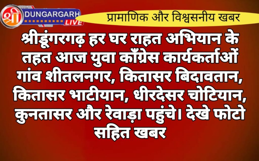 श्रीडूंगरगढ़ क्षेत्र में कांग्रेस के कार्यकर्ताओं के प्रयासों से कांग्रेस के साथ देने वाले नागरिकों में हाथ से हाथ जोड़ा जा रहा है और साथ ही दिल से दिल भी जुड़ रहे हैं। कांग्रेस के युवा नेता हरिराम बाना द्वारा राज्य सरकार की जनकल्याणकारी योजनाओँ को क्षेत्र के प्रत्येक नागरिक तक पहुंचाने के लिए चलाये गए हर घर राहत अभियान के तहत गुरुवार को युवा टोली विधानसभा क्षेत्र के गांव शीतलनगर, कितासर बिदावतान, कितासर भाटीयान, धीरदेसर चोटियान, कुनतासर और रेवाड़ा पहुंचे। इन गांवो में तुलशीराम जाखड़, भियाराम जाखड़,बाबूलाल चोटिया,बलराम हरडू,सूरज चोटिया,शुभम शर्मा,गणपत जाखड़ ने हर घर तक पुस्तिका का वितरण किया। इस दौरान कार्यकर्ताओं ने नागरिकों को राजस्थान में काँग्रेस सरकार रिपीट नही होने पर सभी योजनाएं बन्द कर देने का खतरा समझाया। अभियान के चौथे चरण के तहत इन गांवो में हर घर तक पहुंचा जा रहा है !!