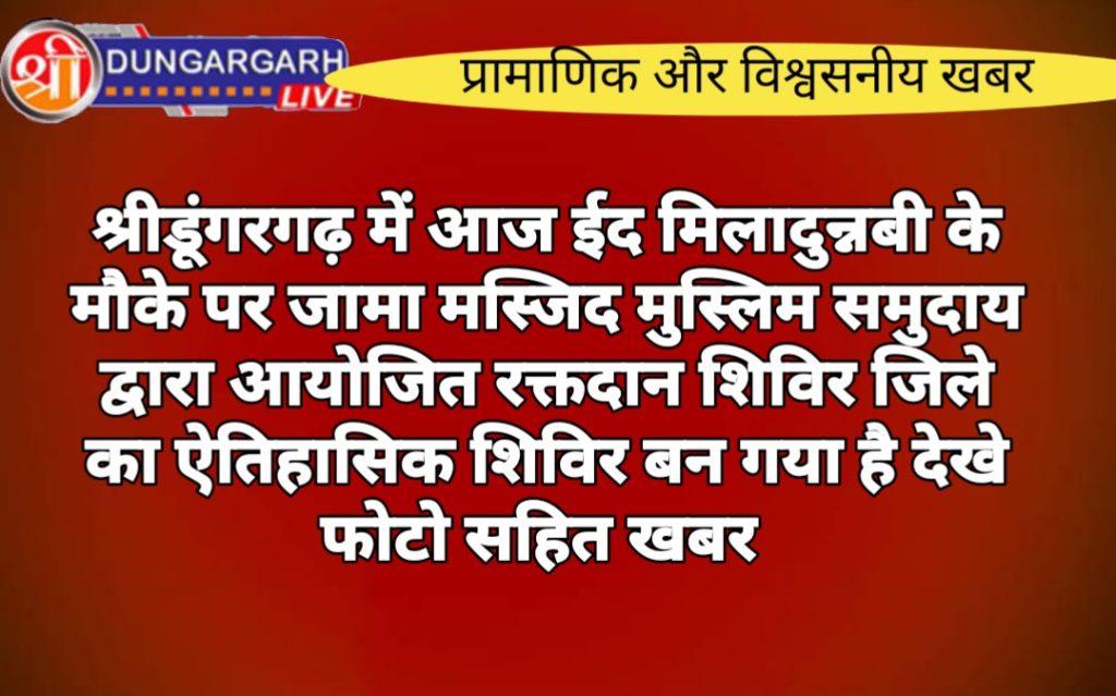 श्रीडूंगरगढ़ में आज ईद मिलादुन्नबी के मौके पर जामा मस्जिद मुस्लिम समुदाय द्वारा आयोजित रक्तदान शिविर जिले का ऐतिहासिक शिविर बन गया है। तीन रक्त संग्रहण टीमों ने यहां शाम 5.30 तक रक्त संग्रहण किया और जिले में नया रिकॉर्ड हुए 615 यूनिट रक्त संग्रहण करते हुए आयोजक इमाम हुसैन फिक्र ए मिल्लत सोसायटी के लिए गर्व जताते हुए आभार प्रकट किया। यहां रक्त केन्द्र बीकानेर, बीकाणा ब्लड बैंक व जनसेवा ब्लड सेंटर की तीनों टीमें भी हैरान है कि किसी को जीवनदान देने के लिए ये उत्साह व जोश युवा शक्ति और महिला शक्ति में अनयंत्र कहीं नजर नहीं आता है। समुदाय युवाओं ने उत्साह के अपनी दिनभर अपनी सेवाएं शिविर में दी। महिलाओं के रक्तदान की व्यवस्था अलग से की गई और बढ़चढ़ कर महिलाओं ने अपनी भागीदारी निभाई। आयोजक दल के सदस्यों ने सभी रक्तदाताओं का सम्मान किया । आपणो गांव सेवा समिति व नागरिक विकास परिषद ने व्यवस्थाओं में सहयोग दिया। कार्यक्रम का संचालन फरियाद अली ने किया। कार्यक्रम मे विधायक गिरधारीलाल महिया, प्रधान सावित्री देवी गोदारा, उपखंड अधिकारी मुकेश चौधरी पहुंचे और सभी ने रक्तदाता युवाओं का हौसला बढ़ाया। इस दौरान मुख्य अतिथि के रूप में बीकानेर के पूर्व महापौर व पीसीसी सदस्य हाजी मकसूद अली भी शामिल हुए। अली इस दौरान कांग्रेस के नेता प्रतिपक्ष अंजू पारख, भगवानाराम गोदारा, विमल भाटी, रमेश प्रजापत, राधेश्याम सारस्वत, विजयराज सेवग, रोशन अली, रमेश प्रजापत, अजीज सब्जीफरोश, अबूसाहिल भुटा, इकबाल राईन, सलीम बहेलिया, इमराम राईन, अमन छींपा, मनोज कलाल, अयुब खान, रोशनअली, हाजी अब्दुल्ला, आरएलपी नेता डॉ विवेक माचरा, महावीर माली, शिवप्रसाद नाई, भाजपा नेता छैलूसिंह शेखावत, आरएलपी नेता दानाराम घिंटाला, अलताफ सिलावट, साबिर भुट्टा, असगर अली भाटी, अली छींपा, आदिल इकबाल राईन, हसन, साबिर, जमील काजी, समीर भुट्टा सोसायटी के मुख्य कार्यकारणी सदसय ने भी शिविर में पहुंच कर रक्तदाताओं के सम्मान का दायित्व निभाया।