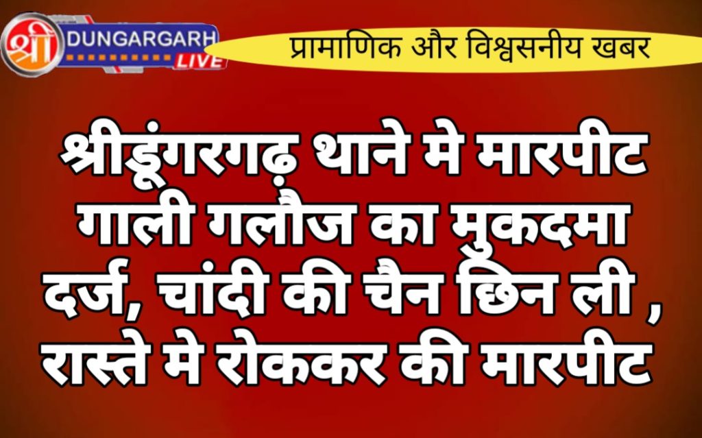 श्रीडूंगरगढ़ थाने मे मारपीट का मुकदमा दर्ज हुआ है गुमानाराम पुत्र कालूराम उम्र 32 साल जाती नायक निवासी कल्याणसर पुराना ने बताया कि मे रात्री के समय रास्ते से जा रहा था तभी सोनूराम पुत्र मामराज नायक और लीछमा देवी पत्नि मामराज नायक कल्याणसर पुराना ने मेरे साथ मारपीट की रास्ते मे मुझे पटक कर लाठियां से मारा और मुझे कहा कि तू हमारे रिस्तेदार के साथ अपनी लडकी का समबन्ध क्यों तोड़ दिया। मेरे गले मे पहनी चांदी की चैन क्षीन कर ले गये, रस्ते मे पड़ोसियो ने बीच बचाव कर मुझे छुड़ाया।मेरे नाक पर बहुत चोट आई है। थाने मे मारपीट का मुकदमा दर्ज कर जांच आवड़दान को सौप दी है