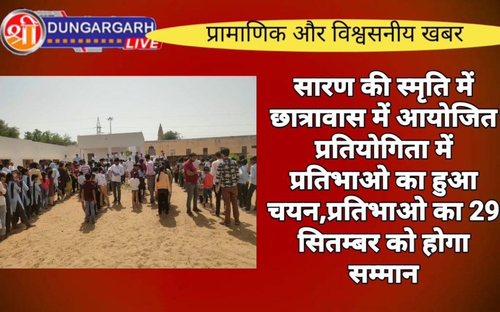 श्रीडूंगरगढ़ महर्षि दयानंद सरस्वती छात्रावास श्री डूंगरगढ़ में लोकनायक स्व. लूणाराम जी सारण कि 27वीं पुण्यतिथी के अवसर पर उनकी स्मृति में सामूहिक रूप से आयोजित हुई सामान्य ज्ञान प्रतियोगिता में 204 एवं भाषण व कविता प्रतियोगिता में 32 विद्यार्थियों ने भाग लिया । संस्था के सुशील सेरडिया ने बताया कि प्रतियोगिता में 6 से 14 आयु वर्ग में प्रथम भावना लिखमादेसर, द्वितीय रामकन्या लिखमादेसर, तृतीय रमन घिंटाला श्री डूंगरगढ़ रहे । 15 से 18 आयु वर्ग में प्रथम कन्हैयालाल लिखमीसर उत्तरादा, द्वितीय मनोज पुनियाँ कितासर, तृतीय राजूराम चोटिया धीरदेसर रहे । 19 से अधिक आयु वर्ग में प्रथम बनवारीलाल जालबसर, द्वितीय धापू बाना तृतीय विक्रम भुंवाल लिखमीसर उतरादा रहे । भाषण व कविता प्रतियोगिता में टॉप इलेवन विद्यार्थियों को 29 सितम्बर को प्रस्तुति के आधार पर विजेता घोषित किया जाएगा । विजेता प्रतिभाओं को स्व. लूणाराम जी सारण की 29 सितम्बर को आयोजित होने वाली श्रंद्धाजलि सभा में नगद पुरस्कार एवं प्रशस्ति पत्र संस्था की ओर से प्रदान किया जाएगा । कार्यक्रम में शिक्षा अधिकारी ईश्वरराम गरुवा, प्रधानाचार्य लक्ष्मीकांत वर्मा, प्रधानाचार्य भागीरथ गोदारा, प्रोफेसर रामनिवास धतरवाल, व्याख्याता हेतदास स्वामी, सरपंच जसवीर सारण, चान्दराम चाहर, भंवरलाल जाखड़, कुम्भाराम घिंटाला, लेखराम गोदारा, जैसाराम भादू, ओमप्रकाश बाना, सुगनाराम जाखड़, कानाराम भाम्भू, हरिराम डोटासरा, मोहनलाल ज्याणी, पेमाराम चोटिया, करणाराम गोदारा, बजरंगलाल ,रामकिशन गावड़िया, भरतसिंह, निराणाराम डूडी आदि ने कार्यक्रम को सफल बनाने में अपनी सेवाएं दी । प्रतियोगिता कार्यक्रम को सफल बनाने वाली टीम एवं भागीदारी करने वाली प्रतिभाओं का श्याम सुंदर आर्य एवं श्रवण कुमार भाम्भू ने का आभार प्रकट किया ।