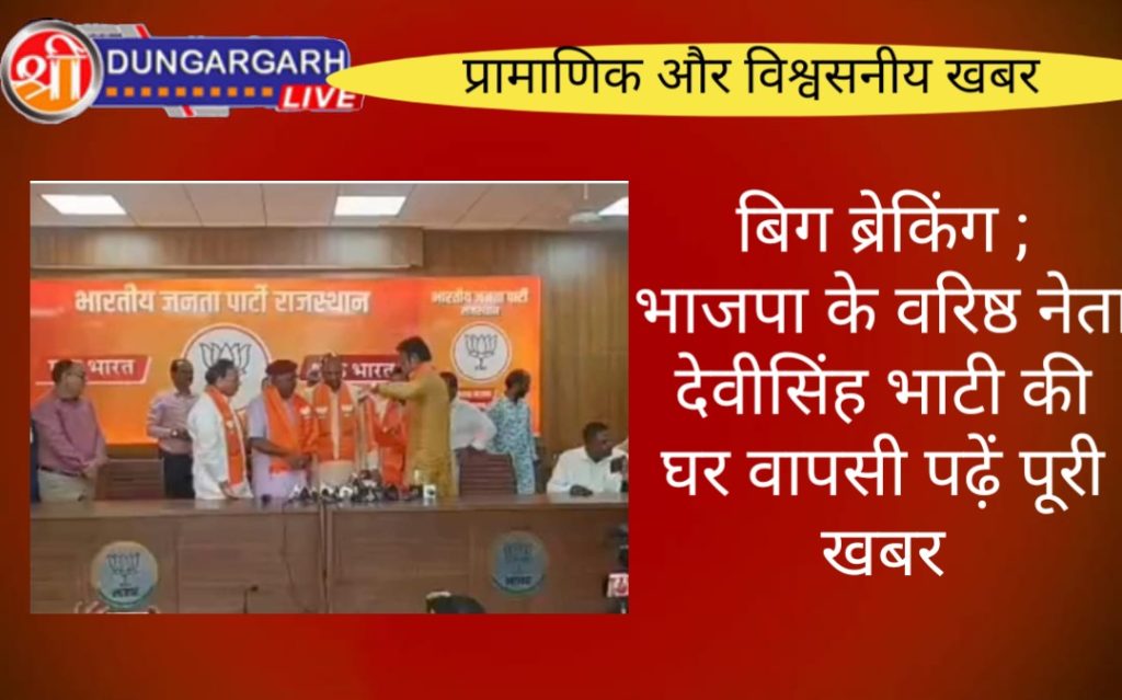 बिग ब्रेकिंग पांच साल बाद देवीसिंह भाटी की आज घर वापसी हो गई यानि वे बीजेपी में शामिल हो गए हैं। जयपुर स्थित पार्टी के कार्यालय में प्रदेश प्रभारी अरुण सिंह, प्रदेशाध्यक्ष सीपी जोशी, राजेन्द्र राठौड़ ने पार्टी का दुपट्टा पहनाकर भाटी को भाजपा में शामिल किया। इस दौरान देवीसिंह भाटी ने कहा कि पांच बाद आपने मुझे छाती पर लगाया इसलिए मैं बहुत गौरवान्वित हूं। जिन परिस्थितियों में कुछ बिन्दुओं पर मैं पार्टी से अलग हो गया था, लेकिन आज पार्टी के पदाधिकारियों के साथ चर्चा हुई, जिसमें गिला सिकवा दूर हो गया। बीकानेर के केन्द्रीय मंत्री अर्जुनराम मेघवाल से भी वार्ता हो गयी, हम दोनों संतुष्ट है। आगे बोलते हुए भाटी ने कहा कि आज पूरा देश ही नहीं बल्कि पूरा विश्व नरेन्द्र मोदी के कारण गौरवान्वित हो रहा है। ऐसे नेतृत्व व परिवार में मेरा पुन: शामिल होना मेरे लिए खुशी का क्षण है।