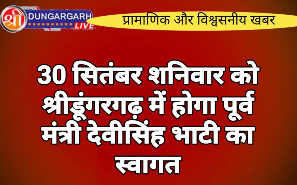 श्रीडूंगरगढ़। पूर्व मंत्री देवीसिंह भाटी भाजपा परिवार में पुन: शामिल होने पर जयपुर से कोलायत जाते वक्त श्रीडूंगरगढ़ में नेशनल हाईवे पर नगरपालिका के सामने भारतीय जनता पार्टी श्रीडूंगरगढ़ के कार्यकर्ताओं द्वारा स्वागत किया जायेगा जिसमें सभी पार्टी कार्यकर्ता शामिल होंगे । देवीसिंह भाटी जयपुर से कोलायत आ रहे श्रीडूंगरगढ़ मे 11.30 सुबह पहुंचेगे