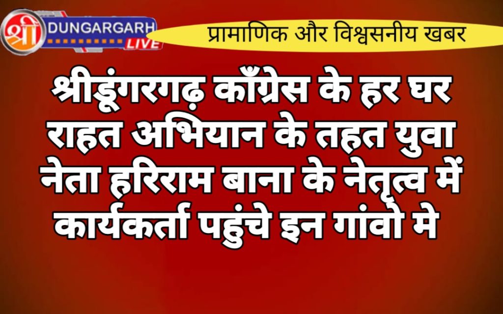श्रीडूंगरगढ़ युवा कॉंग्रेस नेता हरिराम बाना के नेतृत्व मे हर घर राहत अभियान की टीम श्रीडूंगरगढ़ विधानसभा क्षेत्र के गांव धनेरू, कुंपालसर,बाडेला,बरजांगसर, नोरसरीया,मिंगसरिया पहुंची और गांव के प्रत्येक व्यक्ति, प्रत्येक घर,प्रत्येक ढाणी ओर गुवाड़ में जाकर राजस्थान सरकार की जनकल्याणकारी योजना की विशेष पुस्तिका वितरण कर योजनाओं की जानकारी दी इस दौरान टीम मे मौजूद रहे तुलछीराम जाखड़,शुभम शर्मा,मामराज जाखड़,बलराम हरडू,गणपत जाखड़,भियाराम जाखड़,देवीलाल जाखड़ मौजूद रहे।।