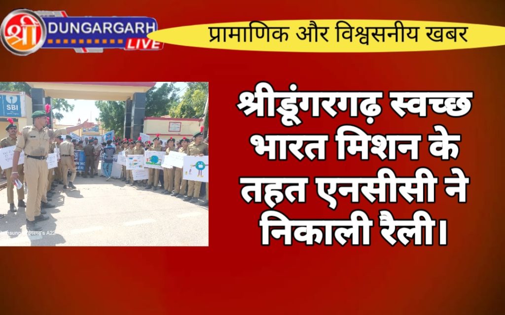 श्रीडूंगरगढ़ स्वच्छ भारत मिशन के तहत एनसीसी ने निकाली रैली। भारती निकेतन स्कूल से मुख्य बाजार मे होते हुवे तहसील मुख्यालय और पुलिस थाने तक रहीं ।एनओ एनससी ऑफिसर नितिन सिंह ने बताया कि रैली का मकसद स्वच्छ भारत और हमारे आसपास का वातावरण क्षेत्र स्वच्छ होना चाहिए और हमे साफ सफाई और स्वच्छता पर ध्यान देना चाहिए 2अक्टूबर को महात्मा गांधी जयंती के उपलक्ष्य पर स्वच्छ संदेश देना है। सिंह ने बताया की जब तक हम खुद से स्वच्छता नहीं करेंगे तब तक कुछ नहीं हो सकता। हमे हमसे स्वच्छता लानी होगी।भारती निकेतन स्कूल एवम् कॉलेज द्वारा आज स्वच्छ भारत अभियान के तहत् रैली निकाली गई । जिसकी शुरुआत भारती निकेतन संस्थान से हुए। हाई स्कूल रोड , बाजार, से घूमचकर होते तहसील होकर पुलिस स्टेशन तक पहुंची। हर घर महोल्ले गलियों में सफाई का संदेश जाय इस लिय इस रैली का आयोजन किया गया। जिसमें विभिन्न प्रकार के नारे गूंजे : स्वच्छ भारत का जन अभियान जाग रहा है हिंदुस्तान।