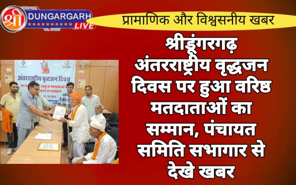 निर्वाचन आयोग द्वारा जिला निर्वाचन अधिकारी कार्यालय के निर्देशानुसार मतदाताओं को जागरूक करने के उद्देश्य से आज अंतरराष्ट्रीय वृद्धजन दिवस पर 80 वर्ष व इससे अधिक आयु के मतदाताओ को श्रीडूंगरगढ़ पंचायत समिति सभागार में तहसीलदार राजवीर कड़वासरा ने किया। तहसीलदार कड़वासरा ने बताया कि उपखण्ड के 241 बूथ स्तर पर ये कार्यक्रम आयोजित हो रहा है। उन्होंने बताया कि सभी पंचायत समितियों पर ये वरिष्ठ मतदाता सम्मान कार्यक्रम आयोजित हो रहा है। कार्यक्रम स्थल पर ही मतदाता जागरूकता अभियान के अंतर्गत उपस्थित सभी वरिष्ठजनों को मतदान प्रक्रिया की भी जानकारी प्रदान की गई। प्रमुख निर्वाचक प्रशिक्षक डॉ राधाकृष्ण सोनी ने सम्पूर्ण मतदान प्रक्रिया की जानकारी देते हुए बताया कि निर्वाचन आयोग ने इस बार उन मतदाताओं को घर बैठे वोट देने का अधिकार दिया है जो मतदान स्थल तक जाने में असमर्थ है। कार्यक्रम में निर्वाचन विभाग के भव्य कटारिया ने मतदाता शपथ दिलवाई।कटारिया ने बताया कि श्रीडूंगरगढ़ के कुल 35 बूथों से 80 से अधिक आयु के सभी वरिष्ठ मतदाताओं का सम्मान किया जाएगा। जो मतदाता इस कार्यक्रम में किसी कारणवश उपस्थित न हो पाए हो उनका सम्मान पत्र संबंधित बीएलओ घर जाकर उनका सम्मान करेंगे। आज 50 वरिष्ठ मतदाताओं का सम्मान किया गया जिनमे श्री केसराराम और श्री डूंगरमल ओझा शतायु मतदाता है।