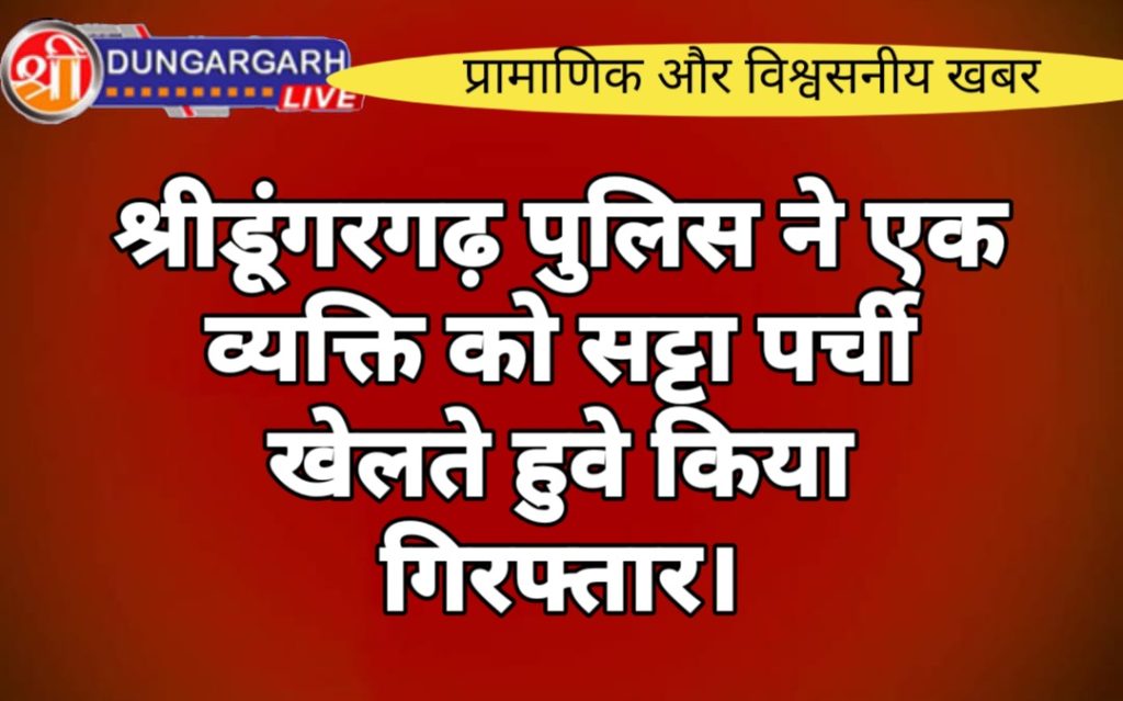 श्रीडूंगरगढ़ पुलिस ने घुमचक्कर के पास एक व्यक्ति को सट्टा पर्ची खेलते हुवे गिरफ्तार किया है जेसे की पुलिस को सूचना मिलती है कि घूम चक्कर पर एक व्यक्ति अन्य व्यक्तियों के साथ पेन और डायरी लिए खड़े है पुलिस तुरंत मौके पर पहुंचती है पुलिस को देख कर सट्टा पर्ची लगाने वाला व्यक्ति भागने की कोशिश करता है लेकिन पुलिस ने उस को गिरफ्तार कर लिया, पुलिस के नाम पूछे जाने पर उस व्यक्ति ने अपना नाम मोहम्मद हुसैन पुत्र असगर अली उम्र 48 साल निवासी मोमासर बास बताया पुलिस ने तलाशी लेने पर उसके पास 370 रुपये, एक पेंन ,एक पर्ची और काग़ज़ मिले ।पुलिस ने व्यक्ति को गिरफ्तार कर जांच सुरेश गुर्जर को सौप दी।