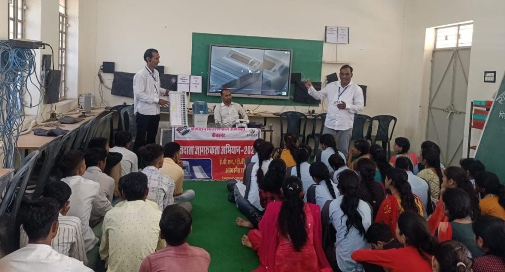 राजस्थान निर्वाचन आयोग और जिला निर्वाचन अधिकारी बीकानेर के निर्देशानुसार निर्वाचक रजिस्ट्रीकरण पदाधिकारी एवं उपखण्ड अधिकारी श्रीडूंगरगढ़ द्वारा गठित एम डी वी टीम बुधवार को श्रीडूंगरगढ़ विधानसभा क्षेत्र की लिखमीसर दिखनादा ग्राम पंचायत की राउमावि लिखमीसर दिखनादा में तथा श्रीडूंगरगढ़ विधानसभा क्षेत्र में आने वाली नोखा पंचायत समिति की ग्राम पंचायत मसूरी की राउमावि मसूरी और राउमावि बीदासरिया में मतदाता जागरूकता टीम पहुँची और स्कूल स्टूडेंट्स के सम्मुख ईवीएम और वीवीपीएटी मशीनों का डेमोंस्ट्रेशन कार्यक्रम रखा गया जिसमें निर्वाचन शाखा श्रीडूंगरगढ़ से नौरत मल शर्मा , सहीराम भामू , किशोरी लाल मीणा आदि दक्ष प्रशिक्षकों द्वारा ईवीएम मशीन वीवीपीएटी मशीन का डेमोंस्ट्रेशन किया गया। नौरत मल शर्मा ने बच्चों को निर्वाचन मतदान प्रक्रिया और ईवीएम से मतदान के बारे में बताया।सहीराम भामू ने ईवीएम और वीवीपीएटी मशीनों से डेमोंस्ट्रेशन करके बच्चों को जागरूक किया।किशोरी लाल मीणा ने मतदाता शपथ दिलवाई।स्कूल विद्यार्थियों ने रुचि और उत्साह के साथ कार्यक्रम में भागीदारी निभाई। राउमावि बीदासरिया में प्रिंसीपल श्री हनुमान प्रसाद छिम्पा ने निर्वाचन विभाग के आगामी नवाचारों के बारे में बताया।राउमावि मसूरी में बी. एल. ओ. जयकिशन हुड्डा ने नए मतदाता रजिस्ट्रेशन की प्रक्रिया के बारे में जानकारी दी।