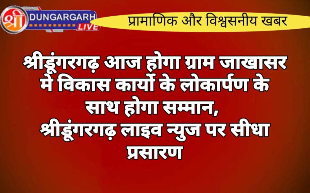 ग्राम पंचायत जाखासर में प्रधान कोटे से करवाए गए विकास कार्यों का लोकार्पण आज गांव में पूर्व विधायक मंगलाराम गोदारा के हाथों किया जाएगा। मुख्य अतिथि मंगलाराम गोदारा, सांसद प्रतिनिधि मदन गोपाल मेघवाल, प्रधान सावित्री देवी गोदारा, प्रधान प्रतिनिधि केशराराम गोदारा होगे। सरपंच प्रतिनिधि मलाराम सारण की अगुवाई में ग्रामीणों द्वारा गोदारा का अभिनंदन किया जाएगा। जाखासर सहित बड़ी संख्या में आसपास गांवो व क्षेत्र से अनेक नागरिक आयोजन में भाग लेंगे। क्षेत्र में होने वाले इस बड़े आयोजन का लाइव प्रसारण श्रीडूंगरगढ़ लाइव न्युज के फेसबुक पेज पर होगा। आप सभी पाठक श्रीडूंगरगढ़ लाइव न्युज के फेसबुक पेज को फॉलो जरूर करें