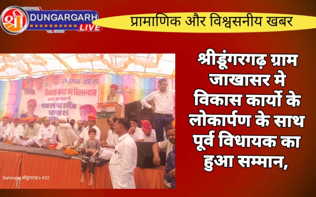 ग्राम पंचायत जाखासर में कांग्रेस जन संपर्क व शिलान्यास सभा का आयोजन किया गया जिसमें 11 करोड़ 55 लाख के विकास कार्यो का लोकार्पण किया मुख्य अतिथि पूर्व विधायक मंगलाराम गोदारा प्रधान प्रतिनिधि केशराराम गोदारा लोकसभा प्रत्याशी मदन गोपाल मेघवाल सम्मिलित हुए वह कांग्रेस नेता श्री राम भादू विमल भाटी मूलाराम थोरी राधेश्याम सारस्वत रामाकिशन मेघवाल धर्माराम हालू रामनिवास जी बरजांगसर पूर्व पंचायत समिति सदस्य सुरेश कुमार मेघवाल युवा नेता रामेश्वर स्वामी जाखासर सम्मिलित हुए सभी पधारे हुए नेताओं का पुरखाराम जी सारण सरपंच प्रतिनिधि ग्राम पंचायत जाखासर ने स्वागत किया ।सभी वक्ताओं ने एक साथ कांग्रेस पार्टी में से मंगलाराम गोदारा को विजय बनाने की घोषणा की ।