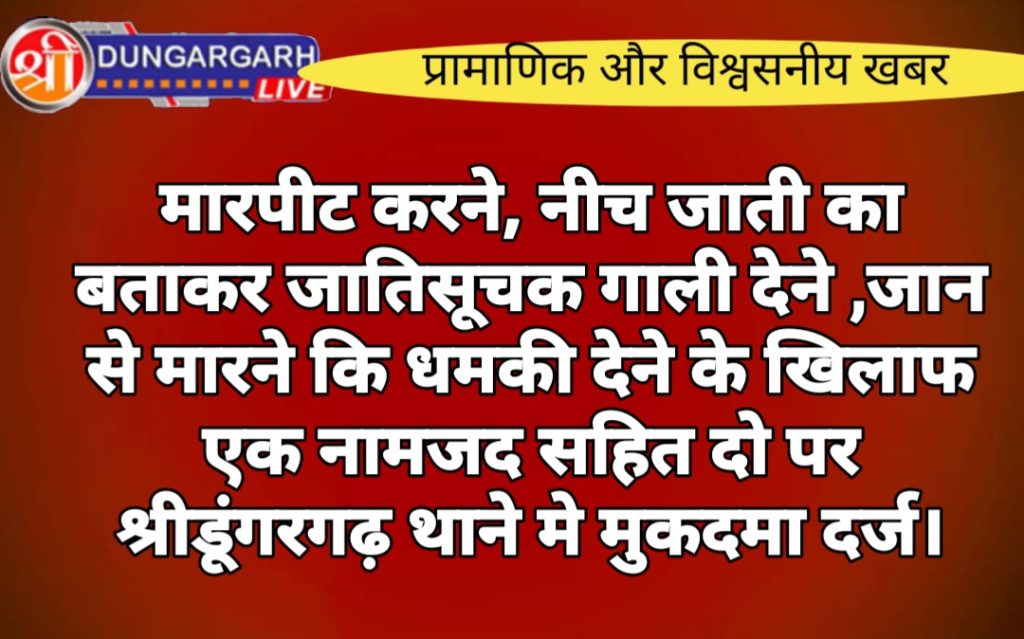 श्रीडूंगरगढ़ थाने में मारपीट करने गाली गलौज देने और जाति सूचक गाली देने के खिलाफ एक नामजद सहित दो पर मुकदमा दर्ज हुआ है दौलत राम पुत्र बुद्धाराम जाती सांसी निवासी मोमासर गांव उम्र 30 साल ने आरोप लगाते हुए कहा कि धनाराम भांभू पुत्र नेमाराम भांभू जाति जाट निवासी मोमासर ने मेरे साथ मारपीट की तथा गाली गलौज किया आरोपी धनाराम के पास दो व्यक्ति और थे उन्होंने भी मेरे साथ मारपीट की उनके हाथ में सरिया और डंडा था जिससे मेरे पर वार किया और मेरे बहुत सारी चोटे आई है जब मैं हला किया तब मेरे घर से परिवार वाले आए । तभी आरोपियों ने मुझे जमीन पर पटक लिया और हाथ में पिस्तौल लेकर मुझे जान से मारने की नीयत से मेरे ऊपर पिस्तौल तान दिया धमकी देते हुए बोले की आइंदा कभी मिलेगा तो जान से मार देंगे तेरे को संसीडा इसी धमकी देकर गए । परिवारवादी की शिकायत पर पुलिस ने धनाराम भांभू सहित एक और पर मुकदमा दर्ज कर जांच गोमाराम आरपीएस को सुपुर्द कर दी है