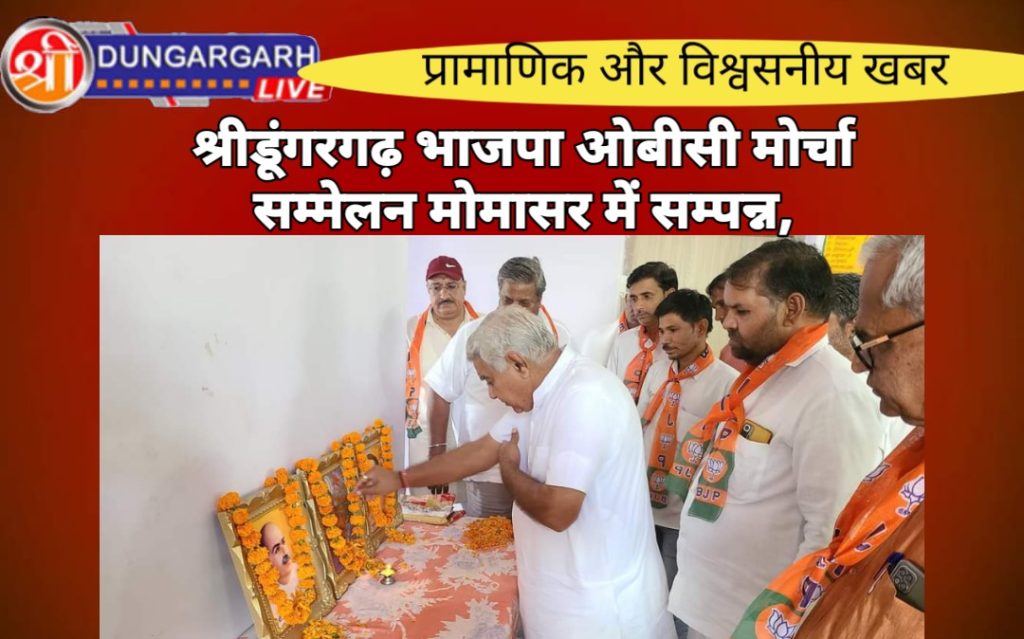 भारतीय जनता पार्टी श्रीडूंगरगढ़ ओबीसी मोर्चा द्वारा श्रीडूंगरगढ़ विधानसभा के मोमासर में प्रजापति भवन में ओबीसी मोर्चा सम्मेलन का आयोजन किया गया कार्यक्रम में मुख्य अतिथि व मुख्यवक्ता श्रीडूंगरगढ विधानसभा प्रभारी बजरंग गुर्जर रतनगढ़ व पूर्व जिलाध्यक्ष ताराचंद सारस्वत रहे। इस अवसर पर श्रीडूंगरगढ़ विधानसभा प्रभारी बजरंग गुर्जर ने कहा भाजपा ने ओबीसी वर्ग को साथ लेकर चलने वाली पार्टी हैं कांग्रेस ने हमेशा ओबीसी वर्ग को ठगने का काम किया है। पूर्व जिलाध्यक्ष ताराचंद सारस्वत ने कहा कांग्रेस के 56 साल के शासन में ओबीसी का कभी भला नहीं हुआ. कांग्रेस ने कभी ओबीसी समाज के लिए काम नहीं किया. कांग्रेस ने हमेशा ओबीसी समाज को प्रताड़ित और अपमानित किया है, जबकि भाजपा ने ओबीसी समाज को सम्मान दिया तथा देश में पहला ओबीसी प्रधानमंत्री भाजपा ने ही बनाया।