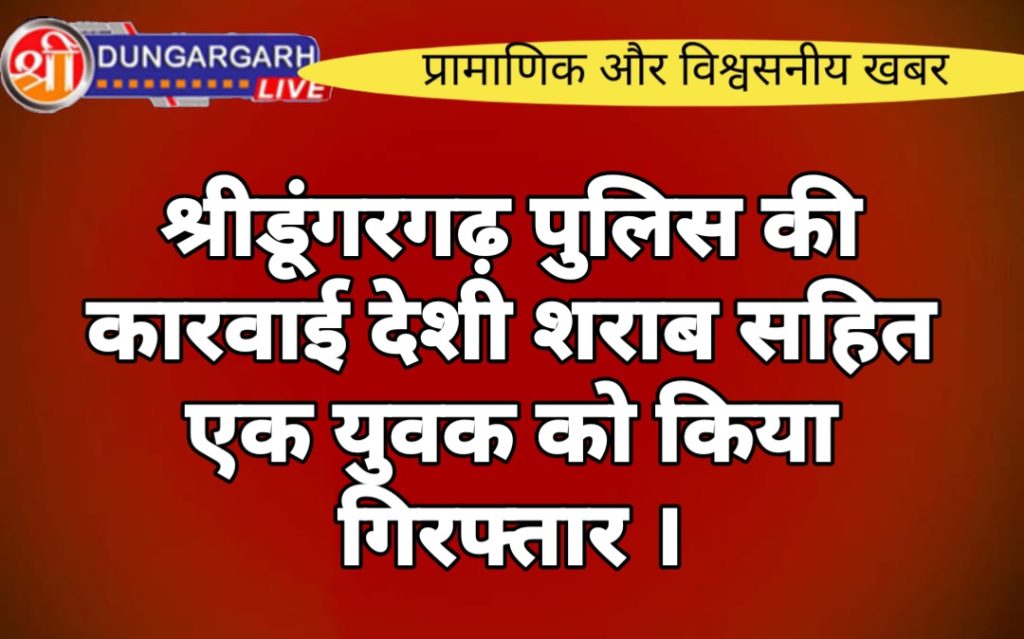 श्रीडूंगरगढ़ पुलिस ने गस्त के दौरान एक युवक को देसी शराब सहित गिरफ्तार कर लिया है पुलिस गस्त के दौरान रेलवे फाटक के पास बीदासर रोड पर एक युवक सफेद कट्टा ले हुए खड़ा था पुलिस को देखकर भागने का प्रयास किया लेकिन पुलिस ने मौके पर ही यूवक को गिरफ्तार कर लिया।पुलिस ने यूवक का नाम पूछा तो उसने अपना नाम बताया लक्ष्मण सिंह पुत्र नानूसिंह राजपूत उम्र 20साल निवासी सोनियासर सुखराम बास बताया तलाशी के दौरान युवक के पास कट्टे में 40 पवे देसी शराब के मिले पुलिस ने शराब जब्त कर ली और युवक को गिरफ्तार कर आगे की जांच हवासिंह को सुपूर्द कर दी