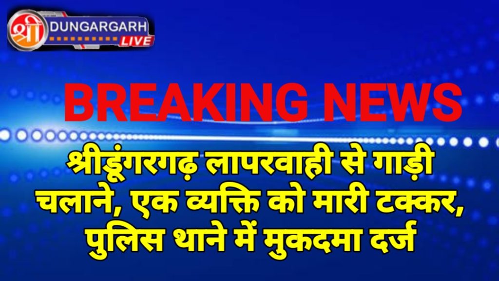 श्रीडूंगरगढ़ लापरवाही से गाड़ी चलाने के आरोप में गाड़ी ड्राइवर पर मुकदमा दर्ज हुआ है विनोद कुमार पुत्र मदनलाल कच्छावा उम्र 56 साल निवासी आड़सर बास श्रीडूंगरगढ़ ने एक पिकअप ड्राइवर पर आरोप लगाते हुए बताया कि मेरे दादाजी विजय स्टोर के पास गली में से गुजर रहे थे तभी एक पिकअप आर जे 07 जी डी 3165 मेरे दादाजी को पीछे से टक्कर मारी और मौके से फरार हो गया। मेरे दादाजी को काफी चोट आई बाजार में आसपास के लोगों ने उनको अस्पताल पहुंचाया। पिकअप ड्राइवर मौके से फरार होने और लापरवाही से गाड़ी चलाने के आरोप में पुलिस ने मुकदमा दर्ज कर आगे की जांच बलवीर सिंह को सौंप दी है