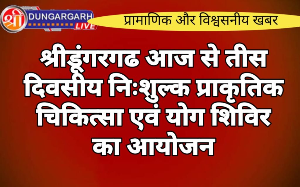 क्षेत्र के नागरिको के स्वास्थ्य के लिये सुखद खबर। श्रीमद आचार्यश्री तुलसी महाप्रज्ञ साधना संस्थान श्रीडूंगरगढ़ के द्वारा तेरापंथ भवन धोलिया नोहरा में निःशुल्क प्राकृतिक चिकित्सा एवं योग शिविर का आयोजन रखा गया है। इस 30 दिवसीय निःशुल्क शिविर का सौजन्य धर्मचंद्र भीखमचन्द पुगलिया चेरिटेबल ट्रस्ट कोलकाता, श्रीडूंगरगढ़ द्वारा किया जा रहा है। शिविर में अनेक असाध्य रोगों का इलाज किया जाएगा।ट्रस्ट के भीखमचन्द पुगलिया ने बताया कि शिविर का उद्घाटन उपखनफ अधिकारी श्रीडूंगरगढ़ मुकेश चौधरी करेंगे। विशिष्ट अतिथि भारत स्कॉउट गाईड एंड डीन- सामु.विज्ञान महाविद्यालय बीकानेर के राष्ट्रीय उपाध्यक्ष डॉ विमल डुंकवाल होगी। शिविर आयोजन कार्यक्रम का संयोजन साहित्यकार रवि पुरोहित करेंगे। कार्यक्रम की अध्यक्षता वरिष्ठ साहित्यकार श्याम महर्षि, समाजसेवी मदनलाल जोशी एवं समाजसेवी धनराज पुगलिया करेंगे।यहां सुबह 6.30 से 7.30 बजे तक योग शिविर लगाया जाएगा व सुबह 8 बजे से दोपहर 1 बजे तक प्राकृतिक चिकित्सा शिविर लगाया जाएगा। शिविर का उद्घाटन उपखण्ड अधिकारी मुकेश चौधरी करेंगे। वहीं मुख्य अतिथि के रूप में भारतीय स्काउट गाइड एवं डीन सामु. विज्ञान महाविद्यालय, कार की राष्ट्रीय उपाध्यक्ष डॉ. विमला डुकवाल, अध्यक्षता प्रबुद्ध चिंतक-साहित्यकार श्याम महर्षि, विशिष्ट अतिथि सामाजिक कार्यकर्ता धनराज पुगलिया, समाजसेवी मदनलाल जोशी, एडवोकेट ललित मारू होंगे। संयोजन साहित्यकार रवि पुरोहित करेंगे। मंत्री मालचन्द सिंघी ने बताया कि महात्मा केवलनाथ प्राकृतिक चिकित्सालय, सीकर के संचालक वरिष्ठ प्राकृतिक चिकित्सक राधेश्याम पारीक व सहयोगी रविप्रकाश पारीक के सान्निध्य में होने वाले 30 दिवसीय शिविर में अनेक प्रकार के रोगों का इलाज किया जाएगा। जैसे कब्ज, गैस, सिर-दर्द, अनिंद्रा, गर्दन दर्द, कंधों का दर्द, पीठ का दर्द, कमर दर्द, घुटनों का दर्द, समस्त जोड़ों का दर्द, साइटिका, बार-बार होने वाले खिंचाव, गठिया-बाय, मधुमेह, मोटापा, अनियमित मासिक धर्म, श्वेत प्रदर, बांझपन (निःसंतानता) आदि का उपचार यौगिक क्रियाओं प्राणायाम, आसन, कसरत, प्राकृतिक चिकित्सा (मिट्टी, जल, धूप, वायु, उपवास), यौगिक मालिश एवं आहार सुधार द्वारा किया जाएगा। योगाभ्यासग योग शिक्षक ओमप्रकाश कालवा व सहयोगी योग नरेन्द्रसिंह राजपुरोहित द्वारा करवाया जायेगा।