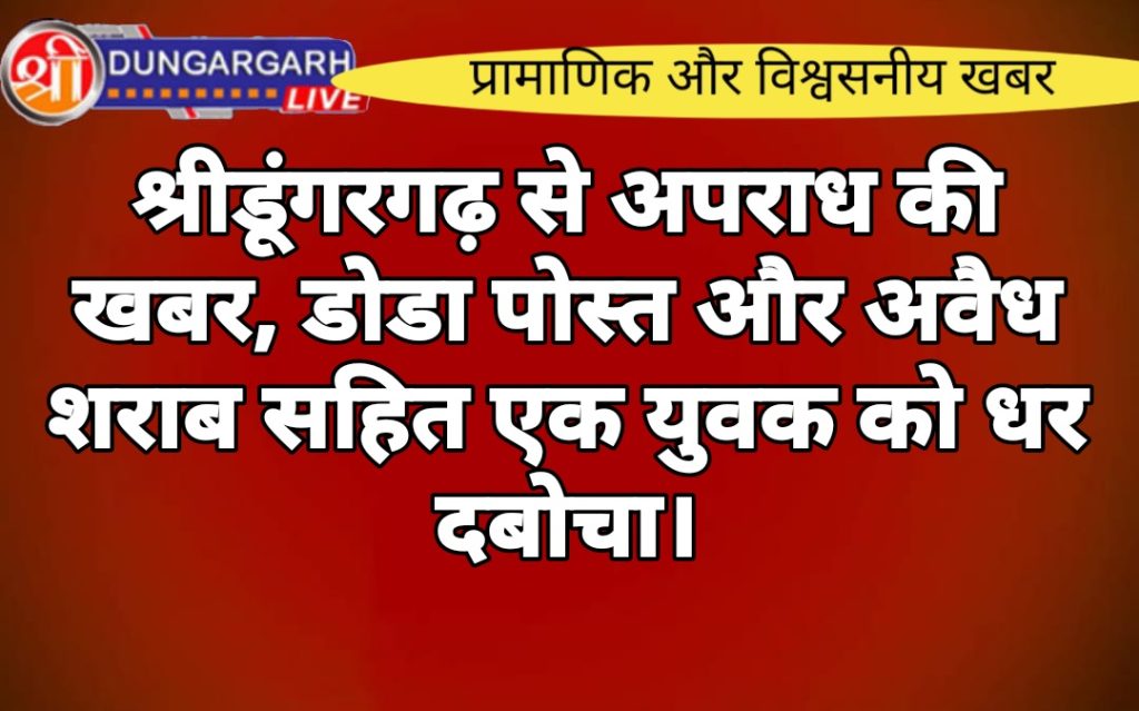 श्रीडूंगरगढ़ चुनावी माहौल को देखते हुए पुलिस विभाग लगातार सक्रिय नजर आ रहा है और लगातार अवैध शराब पर कार्रवाई जारी है पिछले दिनों श्रीडूंगरगढ़ थाने से लगातार अवैध शराब और डोडा पोस्त पुलिस ने बरामद कि थी आज एक और डोडा पोस्त अवैध शराब पर कार्रवाई करते हुए श्रीडूंगरगढ थाने से एसआई बलबीर सिंह कि टीम ने एक व्यक्ति को गिरफ्तार किया जिसके पास सफेद कट्टे में 18 पव्वे मिले और 450 ग्राम डोडा पोस्ट मिले। पुलिस ने कुंतासर निवासी ओम प्रकाश जाट को गिरफ्तार कर मामला दर्ज कर लिया है वह जांच थाना अधिकारी अशोक बिश्नोई को दे दी गई है