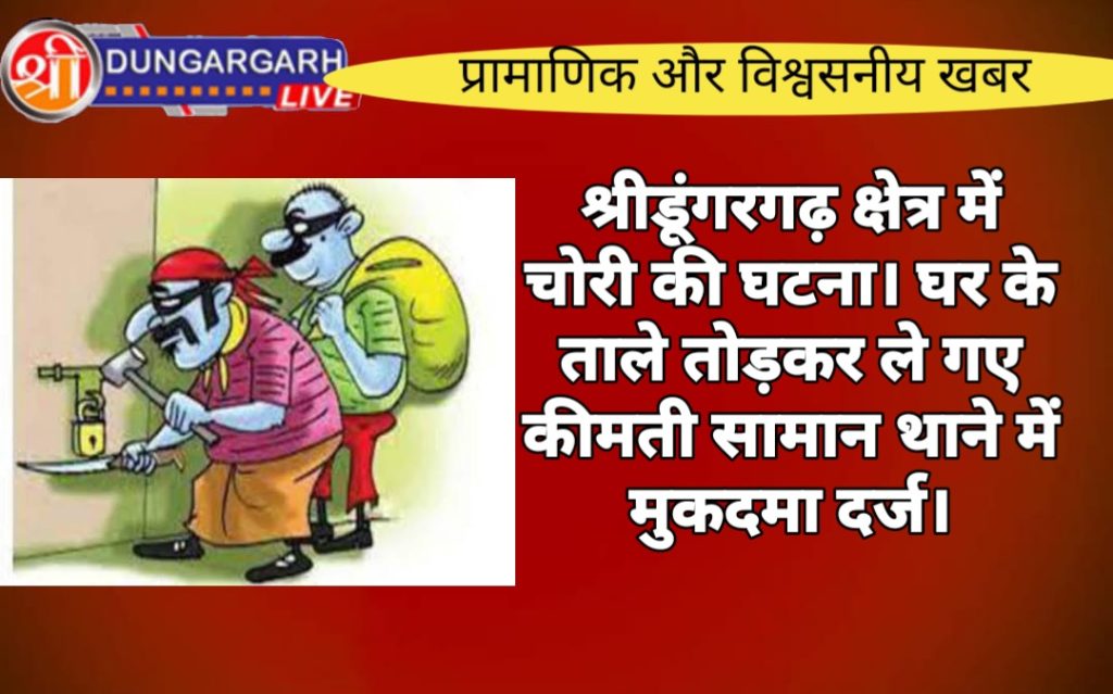 श्रीडूंगरगढ़ थाने में चोरी का मुकदमा दर्ज करवाते हुए ग्राम बेनिसर निवासी रामचंद्र पुत्र प्रभुराम जाति जाट ने बताया कि हम लोग खेत के अंदर रहते हैं जब मेरी पुत्री घर पर लौटी तो घर के सभी ताले तोड़े हुए मिले थे और घर में सारा कीमती सामान कोई अज्ञात चोर चोरी करके ले गया। श्रीडूंगरगढ़ थाने में अज्ञात चोर के खिलाफ मुकदमा दर्ज कर जांच बलबीर सिंह को सौप कर दी है