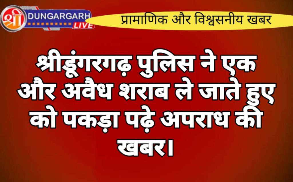 श्रीडूंगरगढ़ चुनावी माहौल को देखते हुए पुलिस विभाग लगातार सक्रिय नजर आ रहा है और लगातार अवैध शराब, डोडा पोस्त पर कार्रवाई जारी है पिछले दिनों श्रीडूंगरगढ़ थाने से लगातार अवैध शराब और डोडा पोस्त पुलिस ने बरामद कि थी आज एक और अवेध शराब पर कार्रवाई करते हुए श्रीडुंगरगढ़ थाने से थानाधिकारी के नेतृत्व में सेसमू स्कूल के सामने बीकानेर रोड पर एक व्यक्ति को गिरफ्तार किया जिसके पास सफेद कट्टे में 48 पव्वे मिले । पुलिस ने ओमप्रकाश पुत्र मांगीलाल मेगवाल उम्र 21साल निवासी कालू बास श्रीडूंगरगढ़ को गिरफ्तार कर मामला दर्ज कर लिया है वह जांच थाना आवड़ दान को सुपूर्द कर दी है
