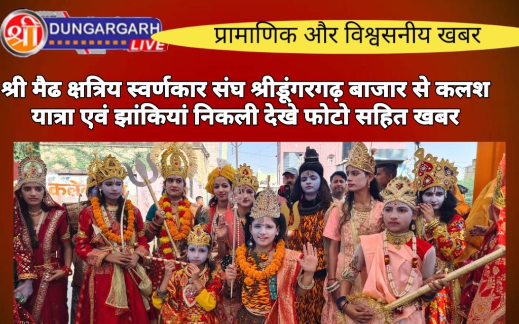 श्री मैढ क्षत्रिय स्वर्णकार संघ श्रीडूंगरगढ़ कलश यात्रा एवं झांकियां निकली कलश यात्रा माताजी के मंदिर से रवाना होकर रानी बाजार घास मंडी होते हुए हाई स्कूल रोड माताजी मंदिर वापस पहुंची। आज नवरात्र के अंतिम दिन स्वर्णकार मंदिर में विभिन्न देवी देवताओं की सुदंर झांकिया सजाई गई है। 151 महिलाओं ने यात्रा में कलश लेकर भाग लिया और गाजे-बाजे के साथ मंगल गीत गाए गए। श्रद्धालुओं ने माता के खूब जयकारे लगाए। यात्रा मार्ग में दो तीन जगह श्रद्धालुओं ज्यूस की व्यवस्था की और स्वर्णकार समाज के अनेक युवा व स्वयंसेवक यात्रा में शामिल हुए। किसी ने अर्द्धनारीश्वर का रूपधरा तो कोई कृष्ण बना है, कोई शनिदेव के रूप में सजा तो कोई राम सीता के वेश में जचे,