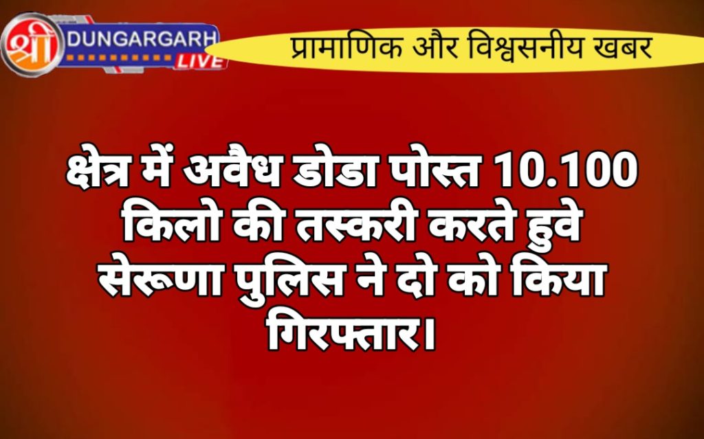 श्रीडूंगरगढ़ क्षेत्र में पुलिस इन दोनों सक्रिय नजर आ रही है और आते जाते वाहनों की तलाशी के साथ-साथ अपने मुखबिरों को भी सक्रिय रखे हुए हैं। ऐसे में क्षेत्र से गुजरने वाले वाहनों की सख्ती से जांच की जा रही है और किसी भी प्रकार की तस्करी करने वालों के खिलाफ कार्रवाई कर रही है। ऐसे में सेरूणा थाना अधिकारी इंद्रलाल शर्मा ने अपनी टीम के साथ कार्रवाईक करते हुए डोडा पोस्त की तस्करी करने वाले दो जनों को गिरफ्तार किया है और उनसे 10 किलो 100 ग्राम डोडा पोस्ट जप्त किया है। आरोपी बोलेरों गाड़ी आरजे07 TA 3908 के साथ सेरूणा से नारसिसर रोड़ पर गिरफ्तार किया आरोपियों को गिरफ्तार करके उनका नाम पूछा तब एक ने अपना नाम मोहनराम पुत्र मालूराम जाति जाट उम्र 37 साल निवासी सेरूणा। शंकरलाल पुत्र बिराजाराम जाति जाट उम्र 38 साल निवासी सेरूणा बताया दोनों आरोपियों को पुलिस ने गिरफ्दार करके अवैध डोडा पोस्त को जप्त कर लिया है आगे की जांच थानाधिकारी अशोक बिश्नोई को सौंप दिए