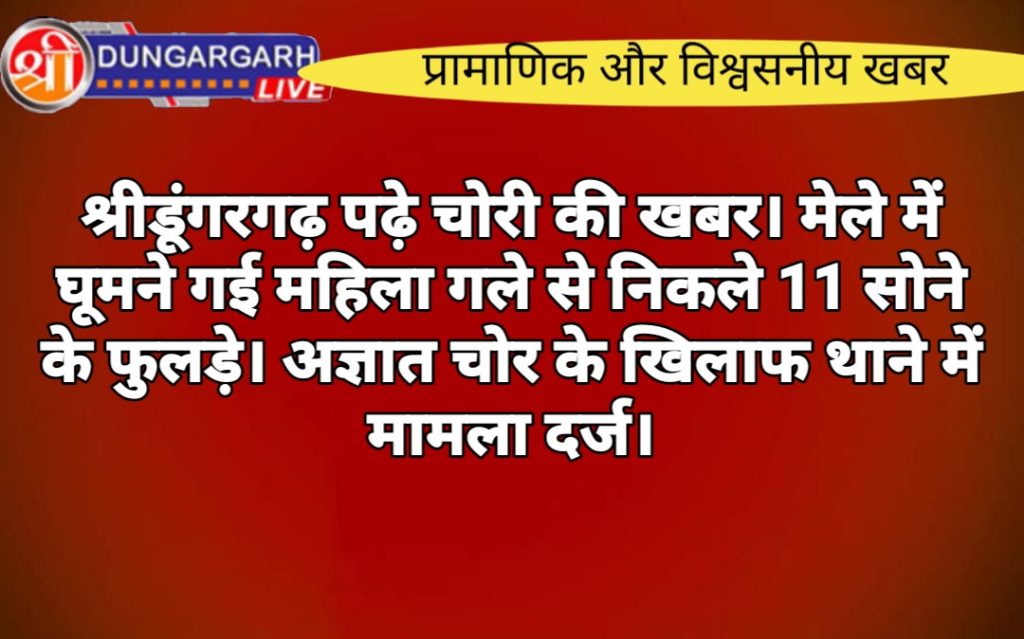 श्रीडूंगरगढ़ एक अज्ञात व्यक्ति के खिलाफ चोरी का मुकदमा दर्ज कराते हुए ग्राम सातलेरा निवासी भजनलाल पुत्र बेगाराम जाति जाट ने बताया कि मेरी माताजी बिग्गाजी के मेले में दर्शन करने आई थी मंदिर में दर्शन करने के लिए लाइन में खड़ी हुई थी तब किसी व्यक्ति ने सोने के 11 फुलड़े गले में थे उनका निकाल लिया करीबन ₹100000 के थे। माताजी ने मुझे तुरंत फोन पर घटना की जानकारी दी तब मैं वहां पहुंचा और वहां के सीसीटीवी कैमरे सब देखे लेकिन मुझे कोई जानकारी नहीं मिली। श्रीडूंगरगढ़ थाने में अज्ञात व्यक्ति के खिलाफ मुकदमा दर्ज कर जांच बलवीर सिंह को सुपुर्द कर दी है।
