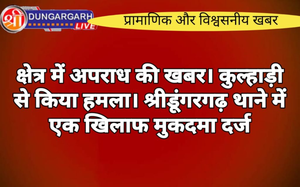 श्रीडूंगरगढ़ थाने में अपने खेत पड़ोसी के खिलाफ मुकदमा दर्ज करवाते हुए विकास पुत्र जीतूराम जाट निवासी उपनी पुंदलसर की ढाणी मे पदमसिंह पुत्र माल सिंह राजपूत के खेत मे कास्त कार्य करता हु। मेरे खेत के पड़ोस में पदमसिंह के ही दूसरे ट्यूबवेल पर कास्त कार्य करते परभूराम जाट निवासी सोनियासर गोदारण को मेने ओल्मा दिया था की आप मेरे ढाणी से मत जाया करो मेरी बहने अकेली रहती हैं। तब तो प्रभुराम वहां से चला गया। जब दूसरे दिन में पाइप लाइन बदल रहा था तब प्रभुराम अपनी मोटरसाइकिल से आया और मुझे जान से मारने की नीयत से कुल्हाड़ी से मेरे ऊपर तीन बार की जिससे मैं जमीन पर गिर गया मेरे घर वालों ने मुझे श्रीडूंगरगढ़ अस्पताल में लाए। श्रीडूंगरगढ़ थाने में प्रभुराम के खिलाफ मुकदमा दर्ज कर जांच एसआई पूर्णमल को सौंप दी हैं।